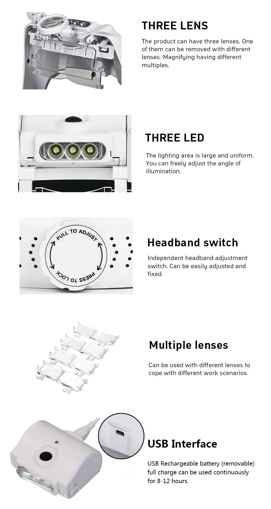 USB Rechargeable LED Lighting Lamp Head Loupe Jeweler Headband Magnifier Eye Glasses Optical Tool Repair Reading Magnifier