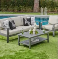 I love this sofa set! The aluminum frame feels solid, and the fabric handles rain and sun perfectly. Great value for the money.