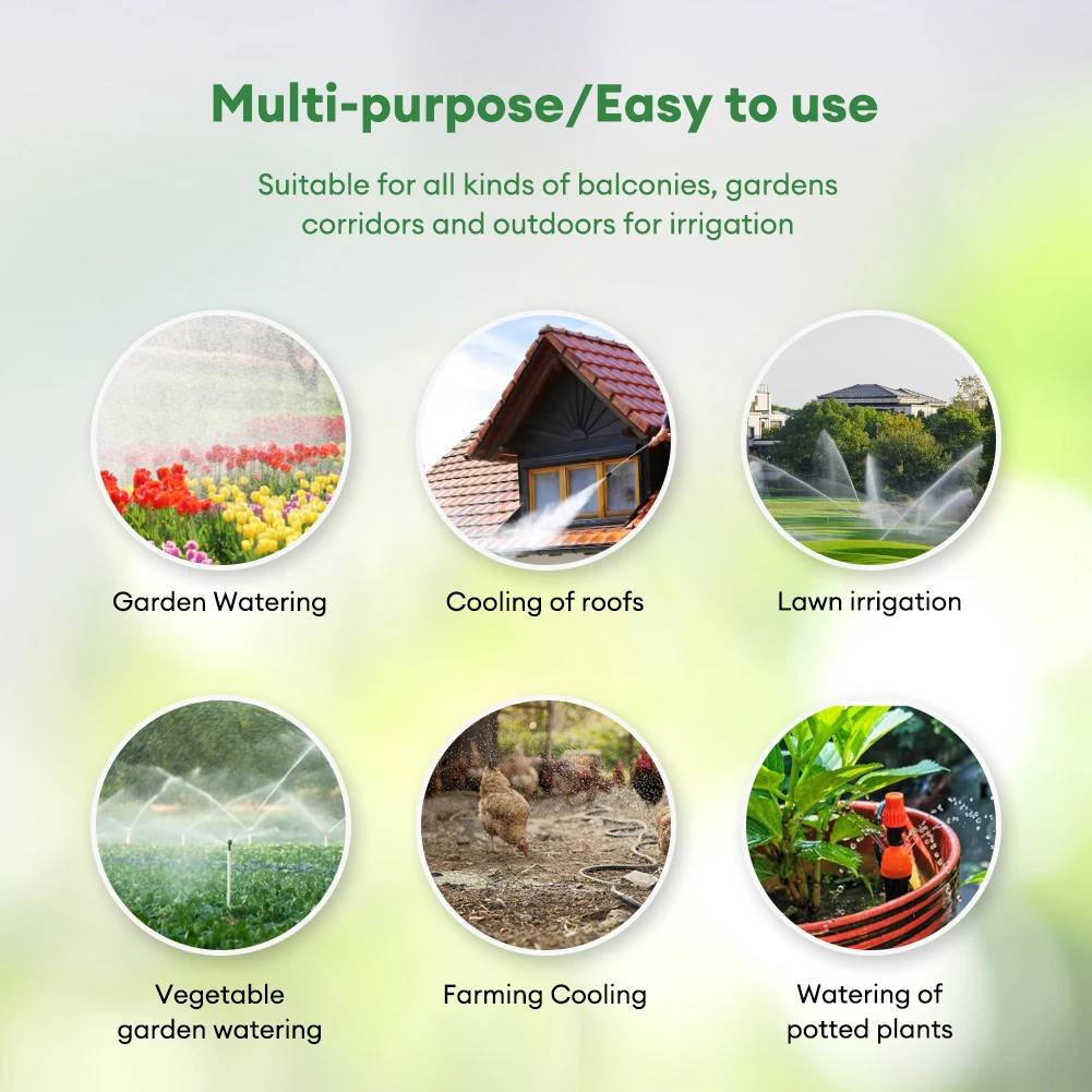 5. Wide Applications: This product is suitable for villa courtyard, balcony garden, roof garden, family green wall, three-dimensional green micro-sprinkler irrigation, construction site engineering dust removal, vegetable garden drip irrigation, sprinkler irrigation and so on.