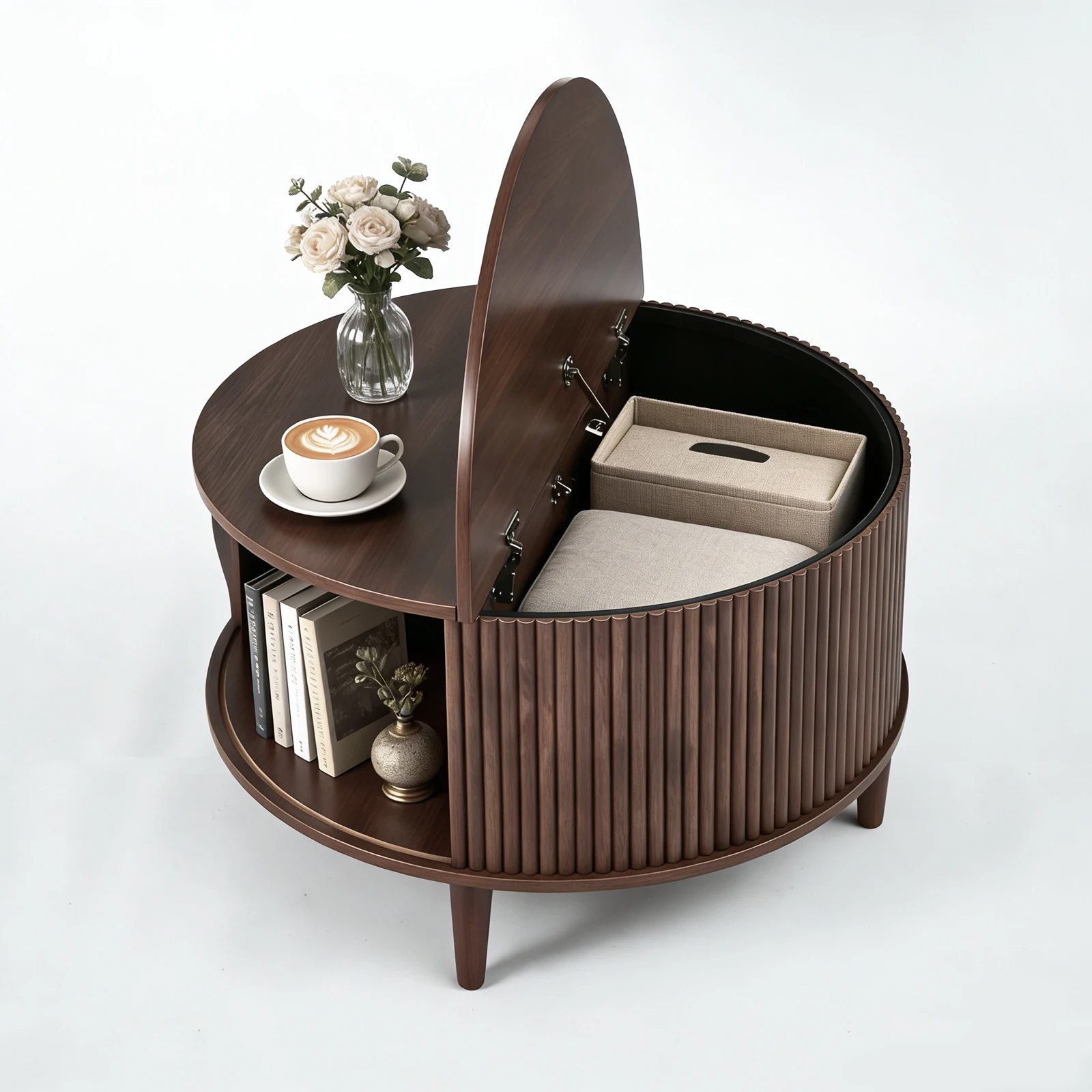 JHK 31IN Round Coffee Table with Flip-Top Storage Fluted Center Table 2-Tier Wood Desktop with Sliding Cabinet Door Living Room