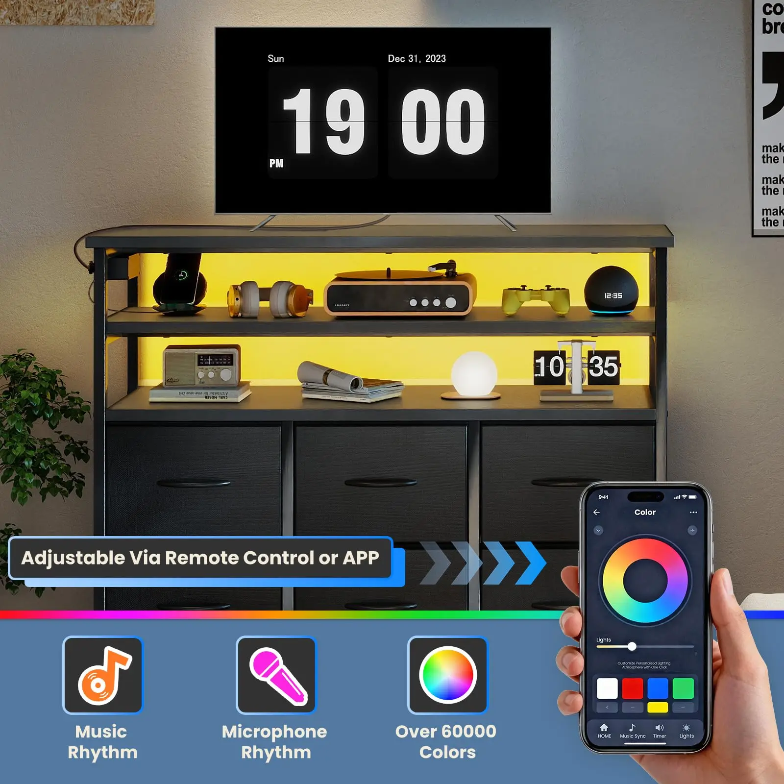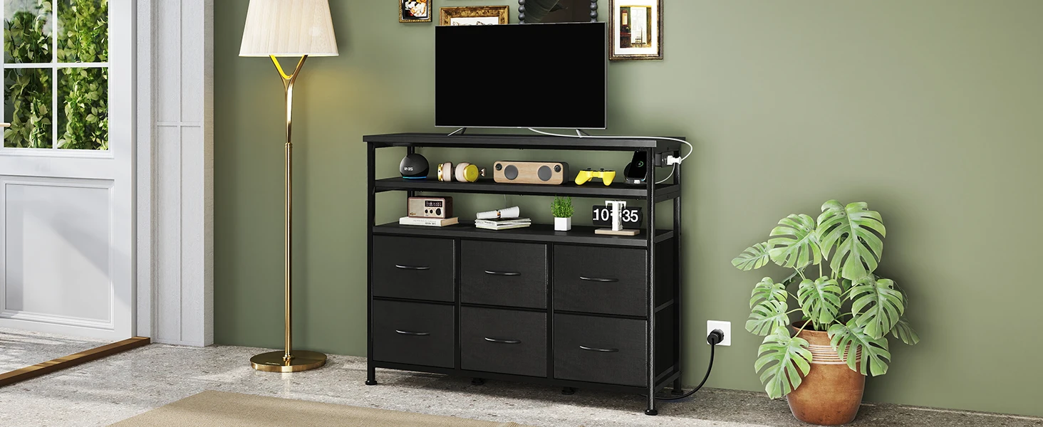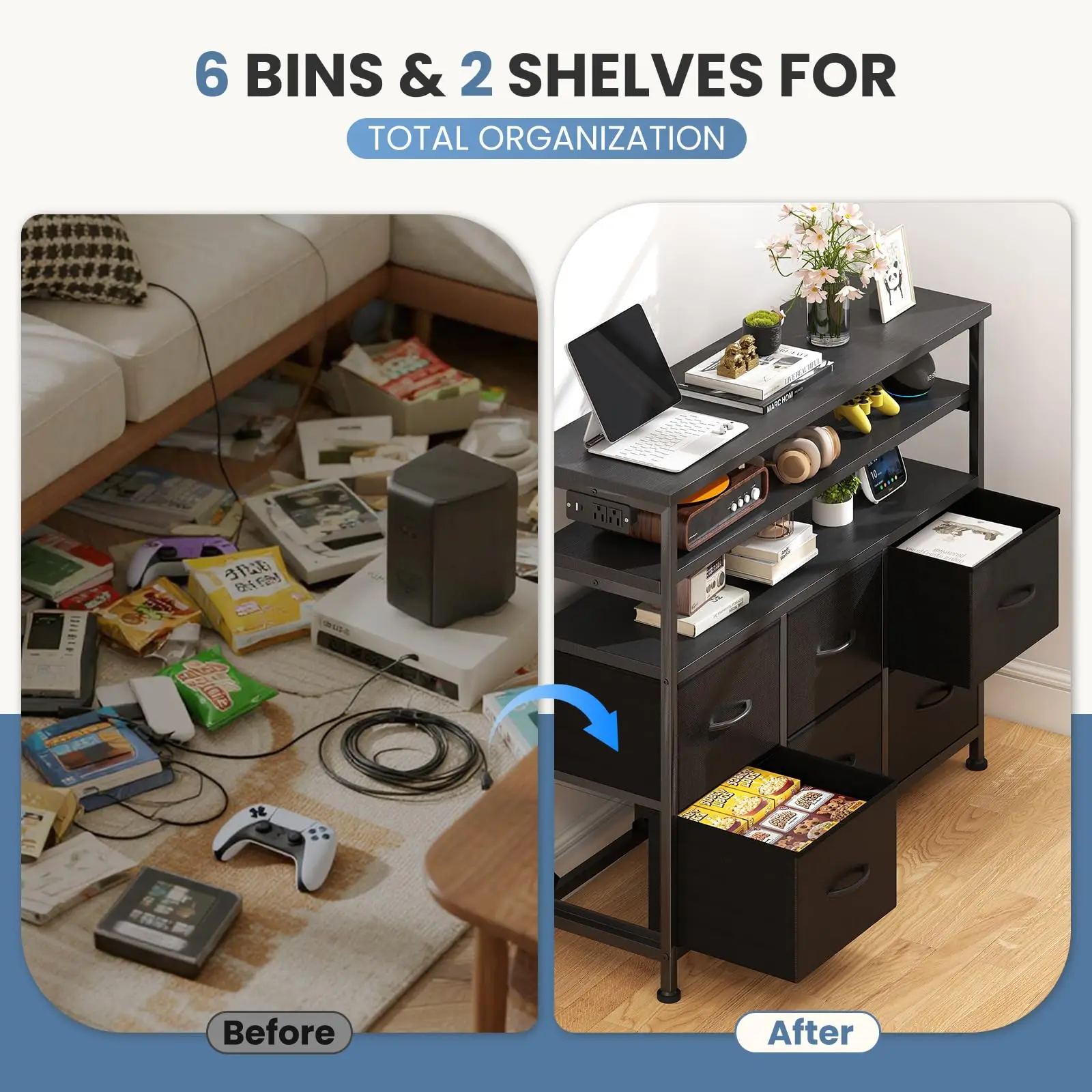 [6 Bins & 2 Shelves for Ample Storage]: Achieve ultimate organization with this practical TV stand with drawers. It features 6 soft-closing fabric drawers and 2 open shelves, providing generous space for media accessories, games, books, and more, helping you maintain a tidy and clutter-free space.