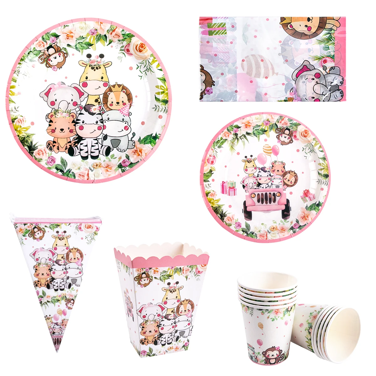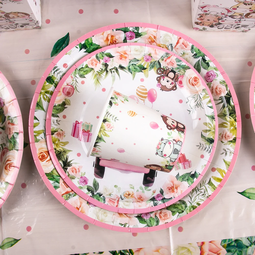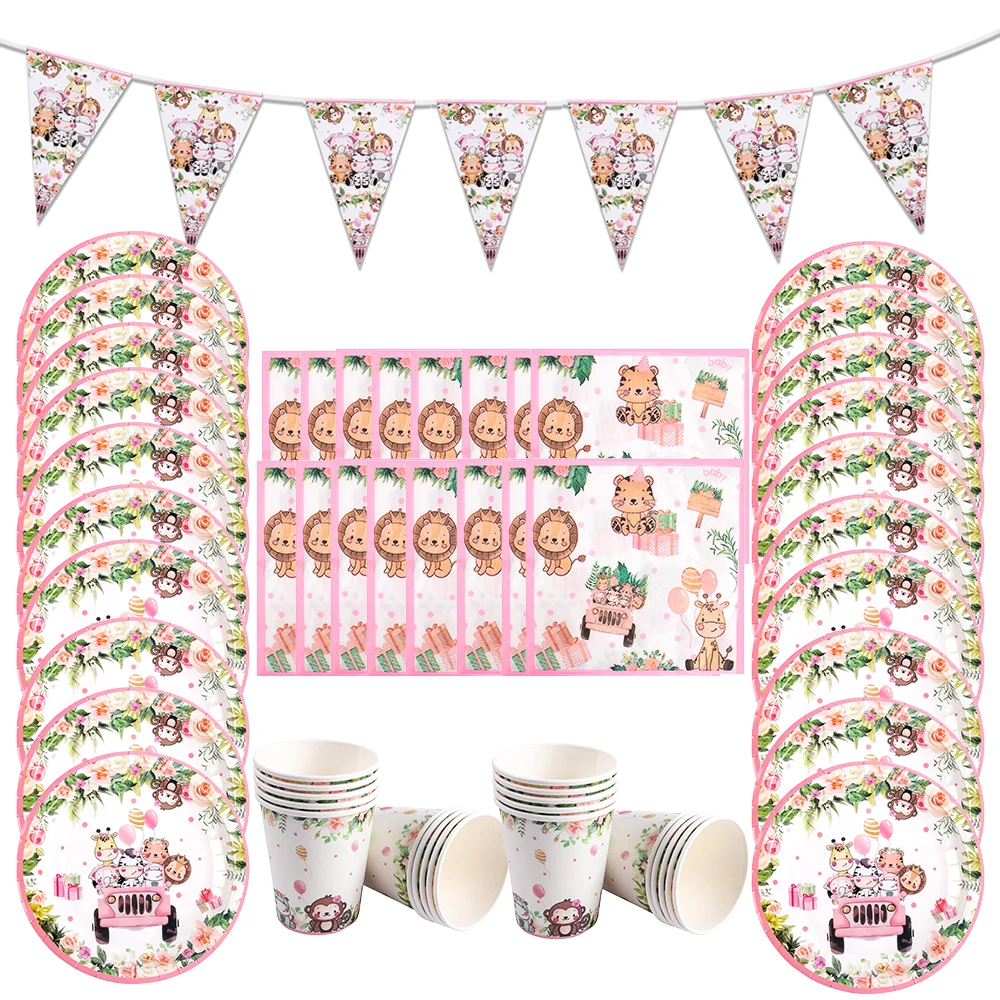 Jungle Safari Party Disposable Tableware Pink Jungle Animal Paper Plate Cup Napkin Banner Kid Girl Wild one Birthday Party Decor