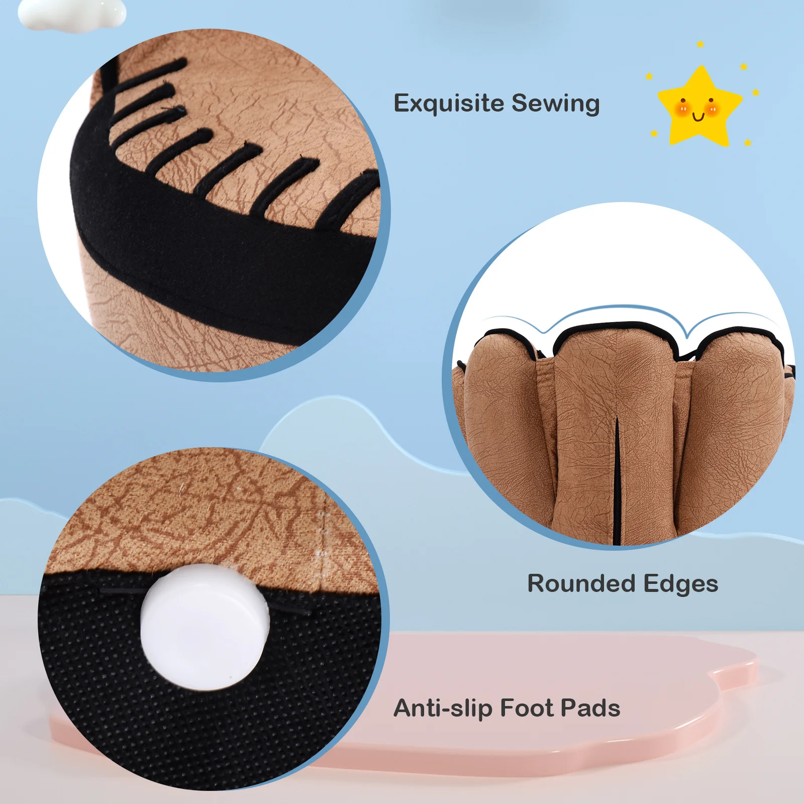 This upholstered chair simulates the shape of a baseball glove which attracts your kids’ attention. Made of solid P2 grade plywood and soft faux suede with high-density 20D sponge padded, this high quality children sofa is comfortable and stable to hold up to 110 lbs. With its lightweight and portable design, this kids sofa is easy for your kids to move.