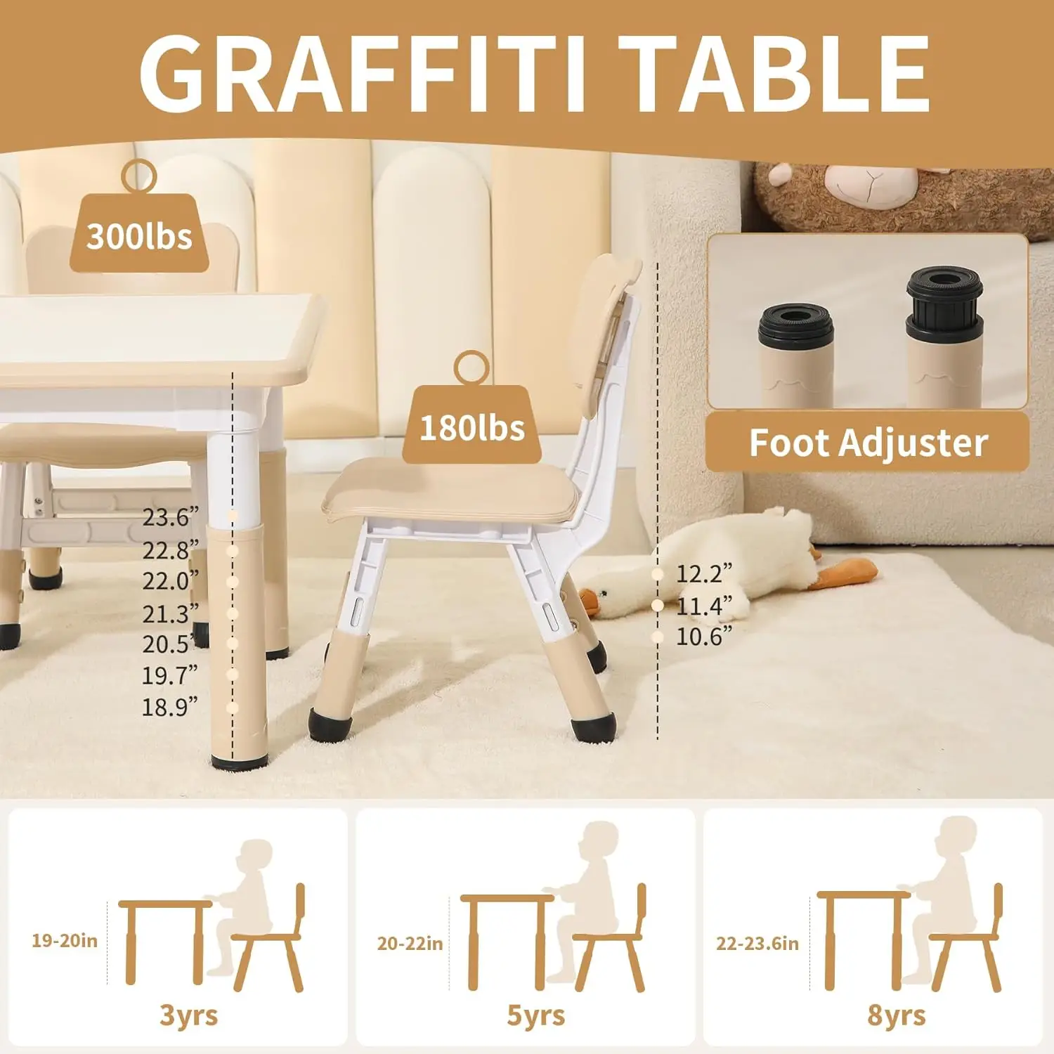 Ideal for arts and crafts, reading, playing, or enjoying snacks, this set is versatile and functional for a variety of activities. The Graffiti desktop adds a fun and creative touch, inspiring young minds to express themselves through art and imagination.