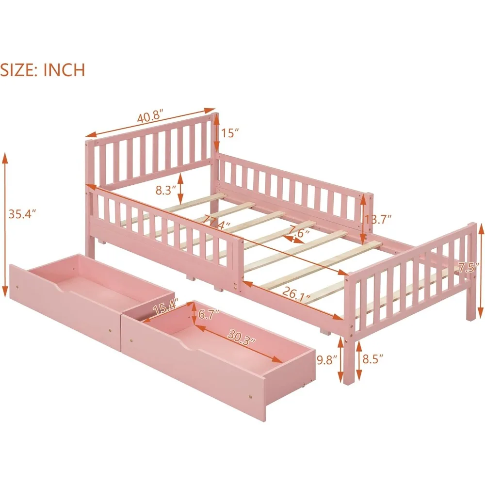 Kids Twin Bed with Guardrails, Low Platform Bed with Headboard and Footboard, Pink Children Bed Frame