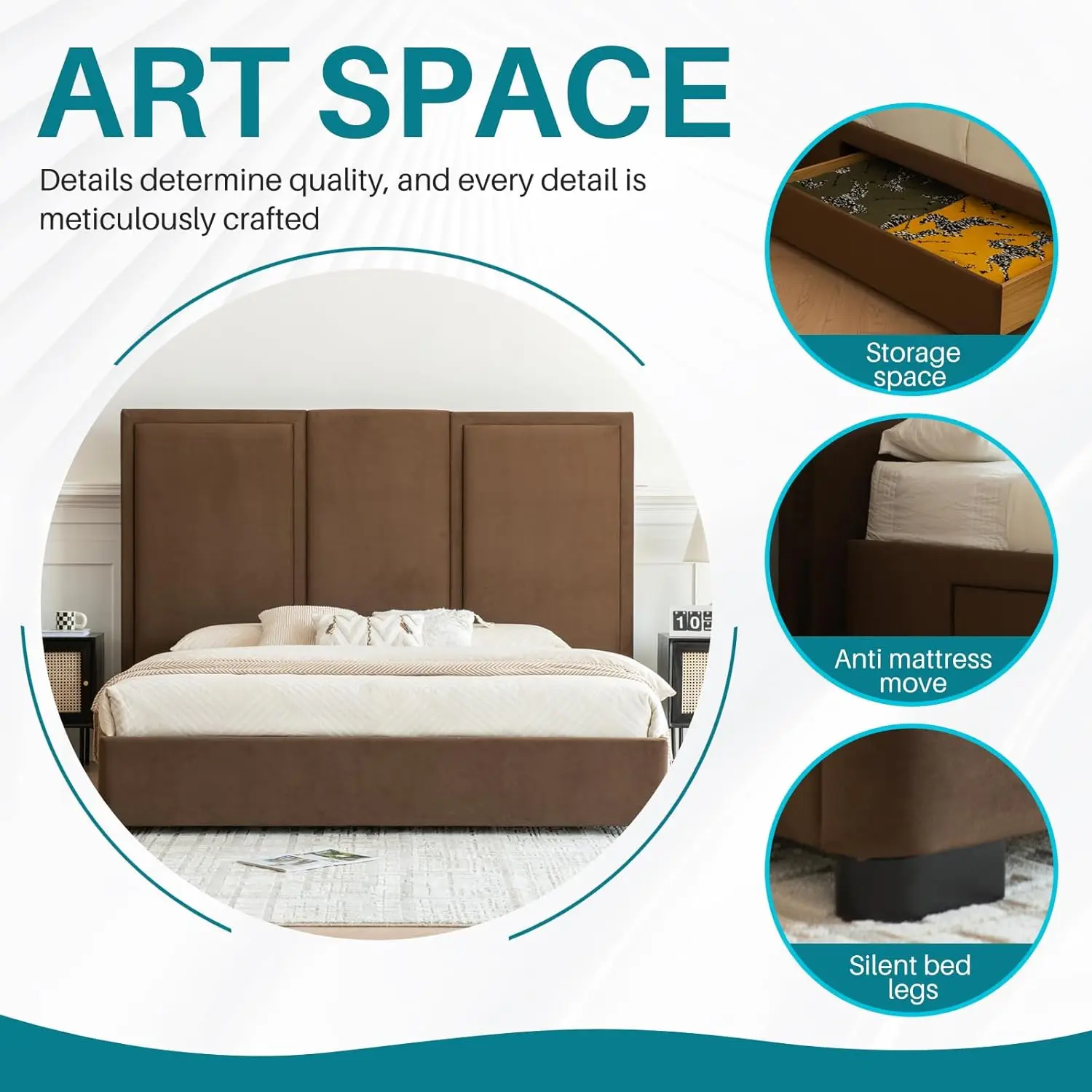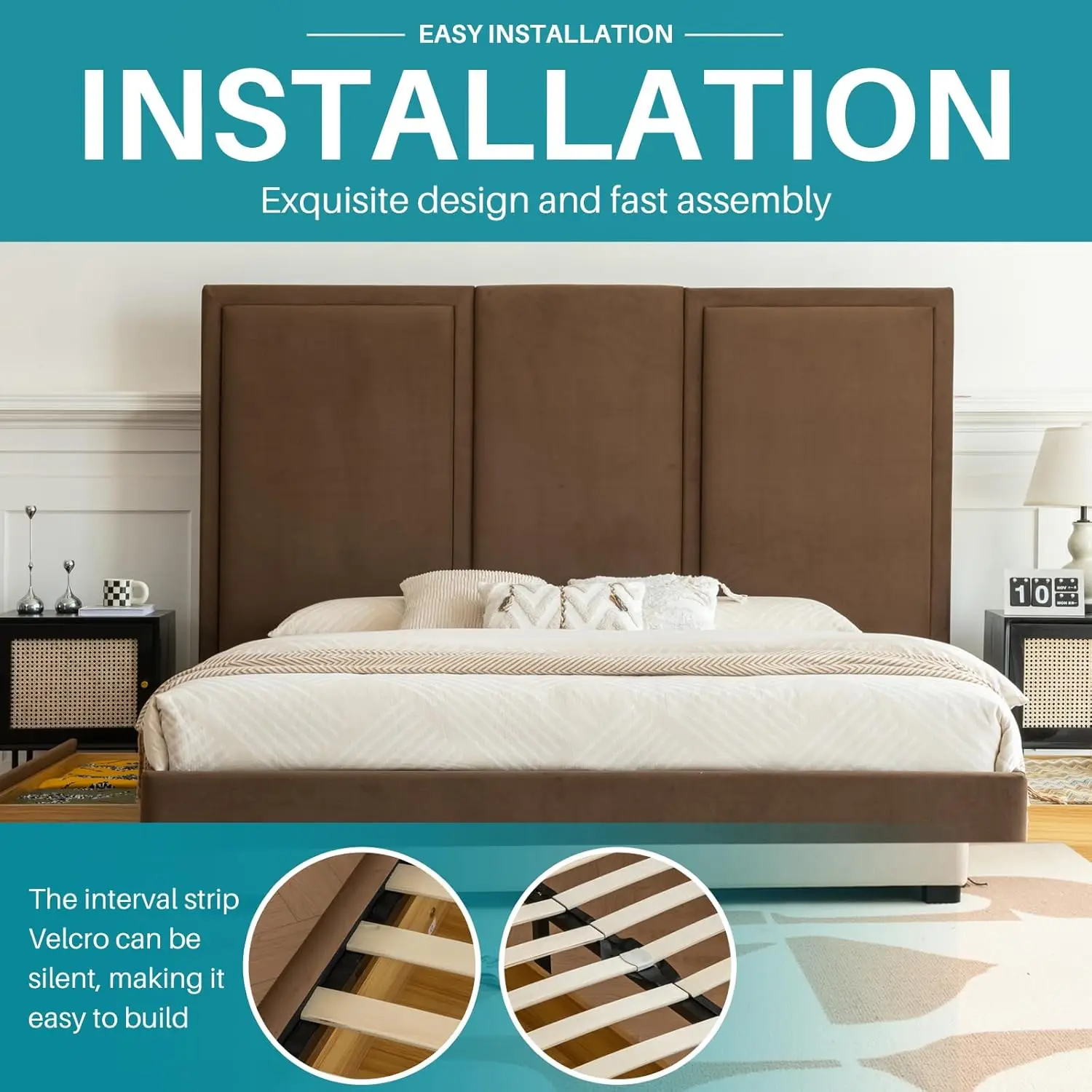 【TALL HEADBOARD】 The 64-inch tall headboard provides excellent neck and back support when backing up against the headboard, effectively promoting relaxation for both mind and body. Meanwhile the classic upholstered bed creates a bold accent to your bedroom with its clean and airy look and extra tall upholstered headboard.