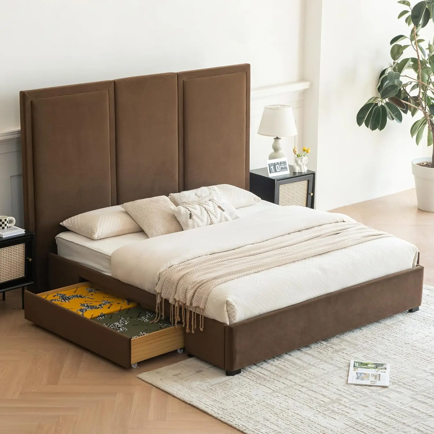 【SPACE-SAVING DRAWERS】There are two oversized drawers underneath the bed frame to meet your different storage needs. The drawers are equipped with rolling wheels, which can be easily pushed in and pulled out for storing all kinds of bedding, clothes and so on. Drawer inner diameter: 44"*5.7"*21".