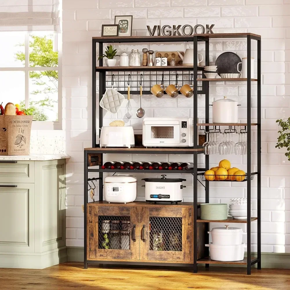 - 【Ample Storage Space】This practical storage rack is 7in1 multifunctional. Its integrated structure includes 8-s hooks, 9 open storage shelves, metal grid, cabinet, wine rack, goblet holder, pull-out wire basket, and is suitable for home kitchens, living room, coffee bar and other scenes.