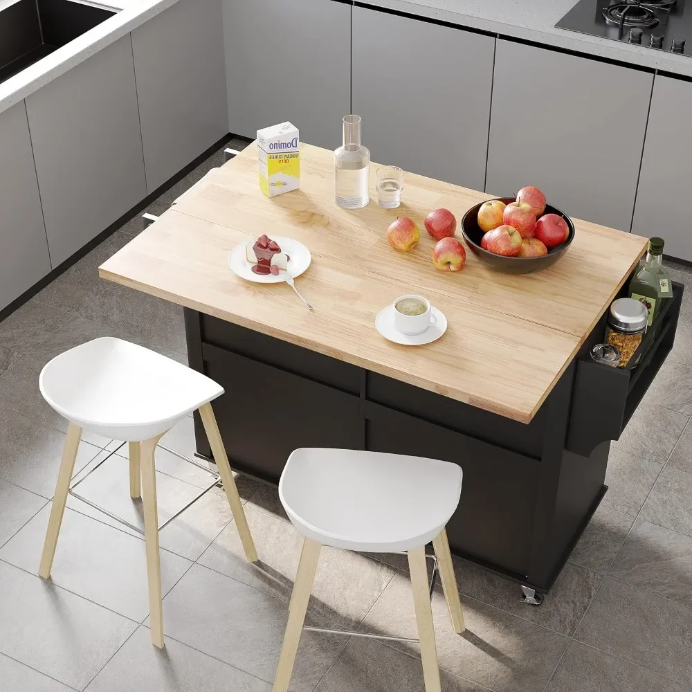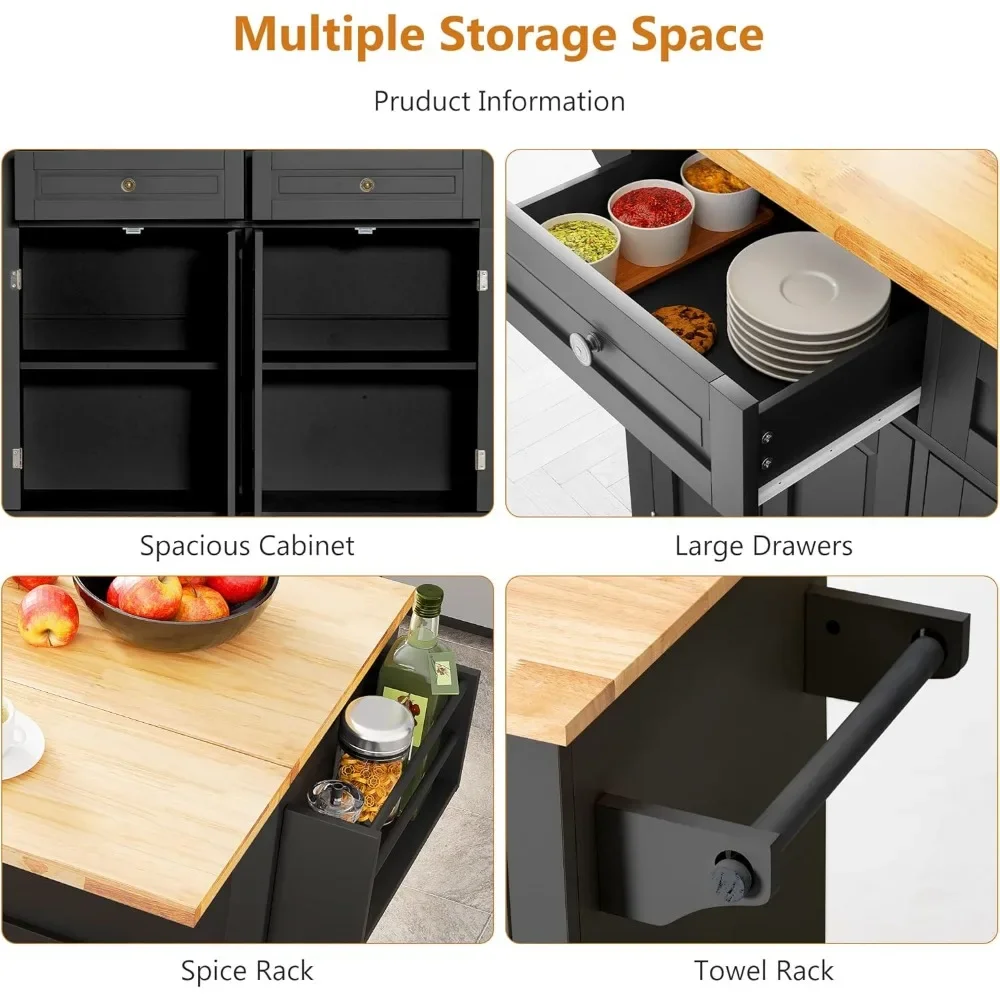 - 【Spacious Storage Space】 kitchen island table features concealed cabinets to store pots and pans, and much more. Featuring a spice rack, a towel bar, 2 open shelves, and a 2-tier cabinet. It can be used to store a variety of kitchen items.