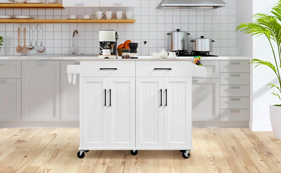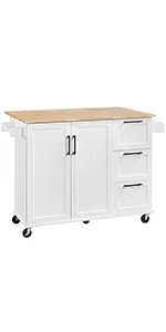 Rolling Kitchen Island with Drop-Leaf Breakfast Bar & 2 Side Pull-outs Mobile Kitchen Island on Wheels Kitchen Island Cart on Wheels with Stainless Steel Top Rolling Kitchen Island with 3 Drawers Rolling Kitchen Island with Power Outlet Kitchen Island with Open Shelves