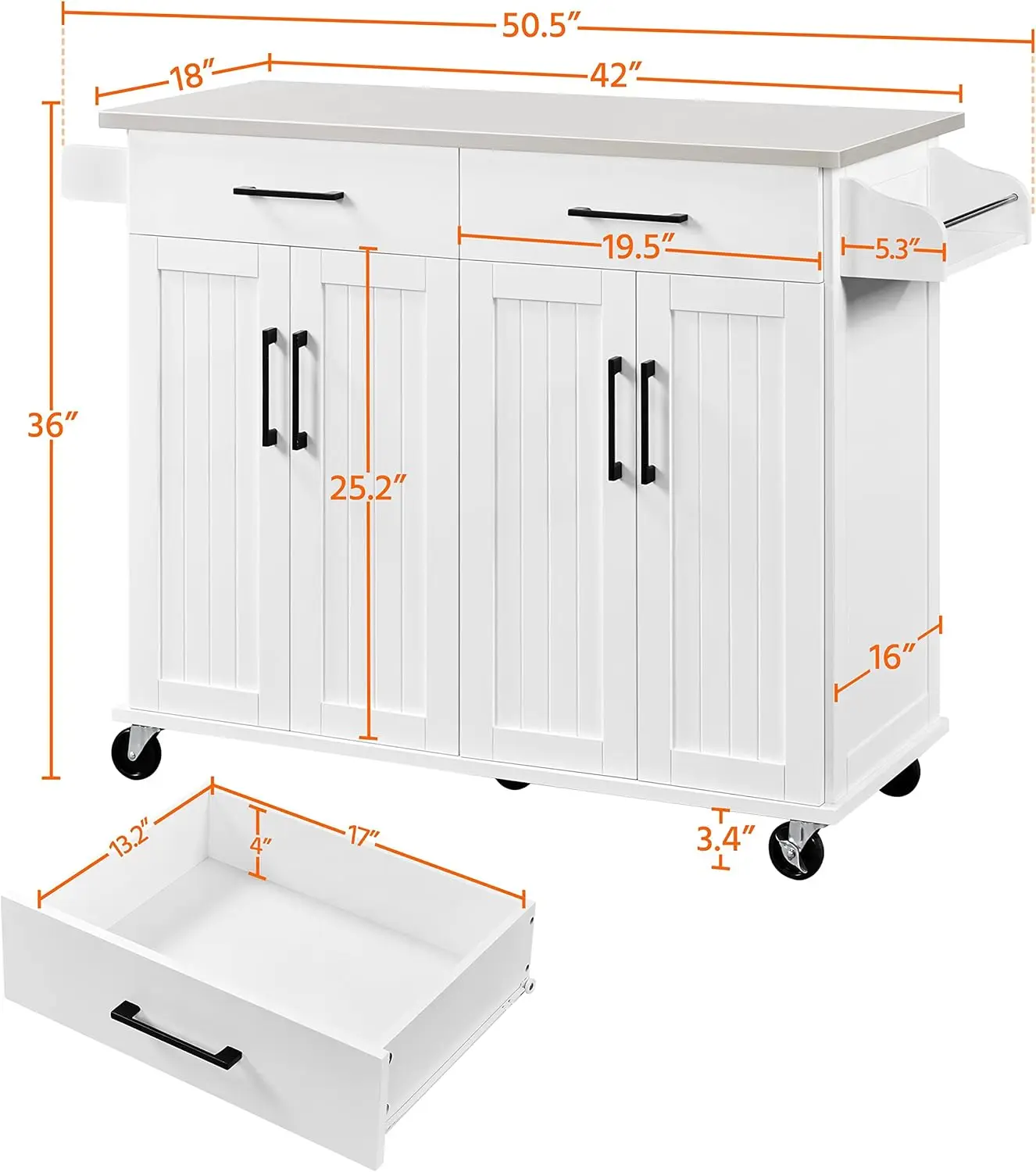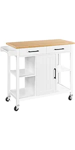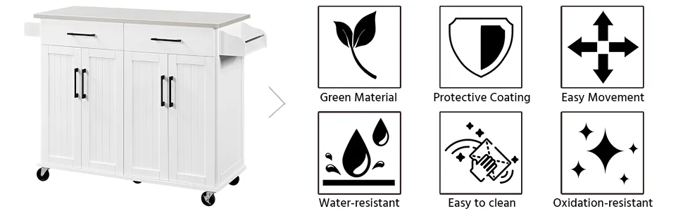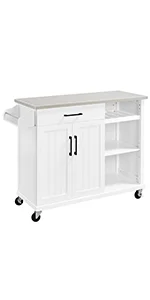 Crafted with CARB P2-compliant MDF and high-quality particle board, this rolling kitchen island boasts durability and a strong load capacity, the tabletop with stainless steel cover is also stain and water-resistant. Stands on five wheels (2 with locks), it sports super convenient and effortless maneuverability and can lock into place if needed. In addition to offering multiple spaces for storage and organization, the cart can also serve perfectly as a breakfast/cocktail bar when paired with counter-height stools.