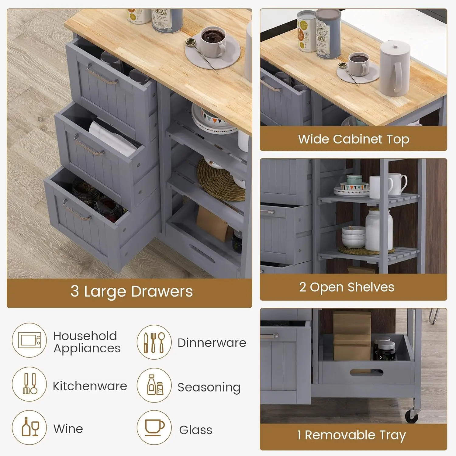 Kitchen Island with Storage, Kitchen Trolley on Wheels with Drawers & Open Shelves, Rolling Mobile Kitchen Island, Customized