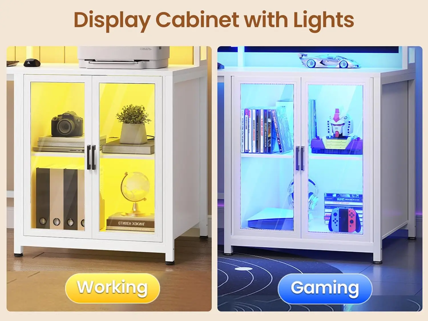 【Display Cabinet & Led Light】This L-shaped gaming desk features a large display cabinet with LED lighting, offering ample space to showcase your decorations, photo albums, collectibles, and more. The cabinet doors protect items from dust while allowing you to clearly admire your displays. The home office desk comes with RGB LED light strip, remote control via APP, Over 60000 colors and 29 flashing modes for your to choose.