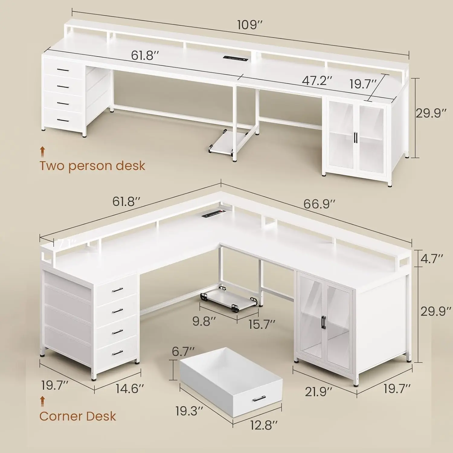 【Spacious Desktop & Reversible Design】The L-shaped computer desk can be installed as a Two Person Desk as needed. The 109 inch long size allows two people to work side by side without affecting the space. The large desktop provides enough space for 3 monitors, laptops, and printers. 4 drawers and display cabinets can be placed on the left or right side according to your needs, perfectly adapting to your room.