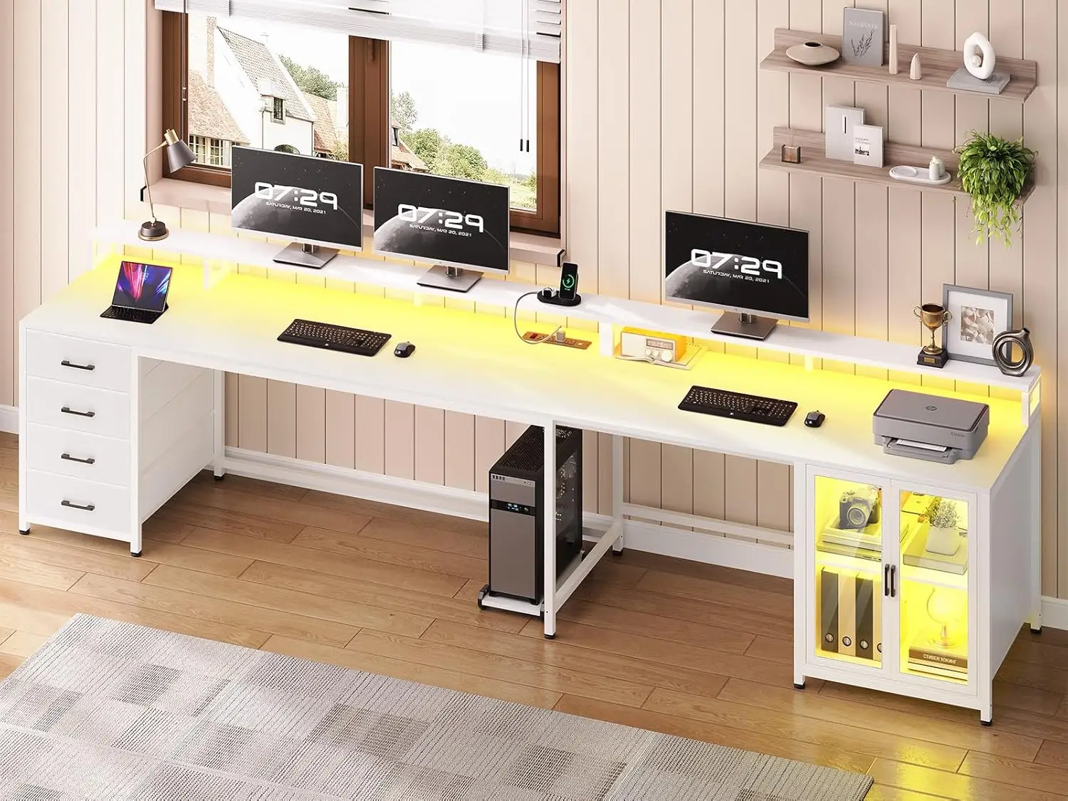 L Shaped Gaming Desk with 4 Drawers, 109” Computer Desk with Display Cabinet, Home Office Desks with 2 Monitor, Customized