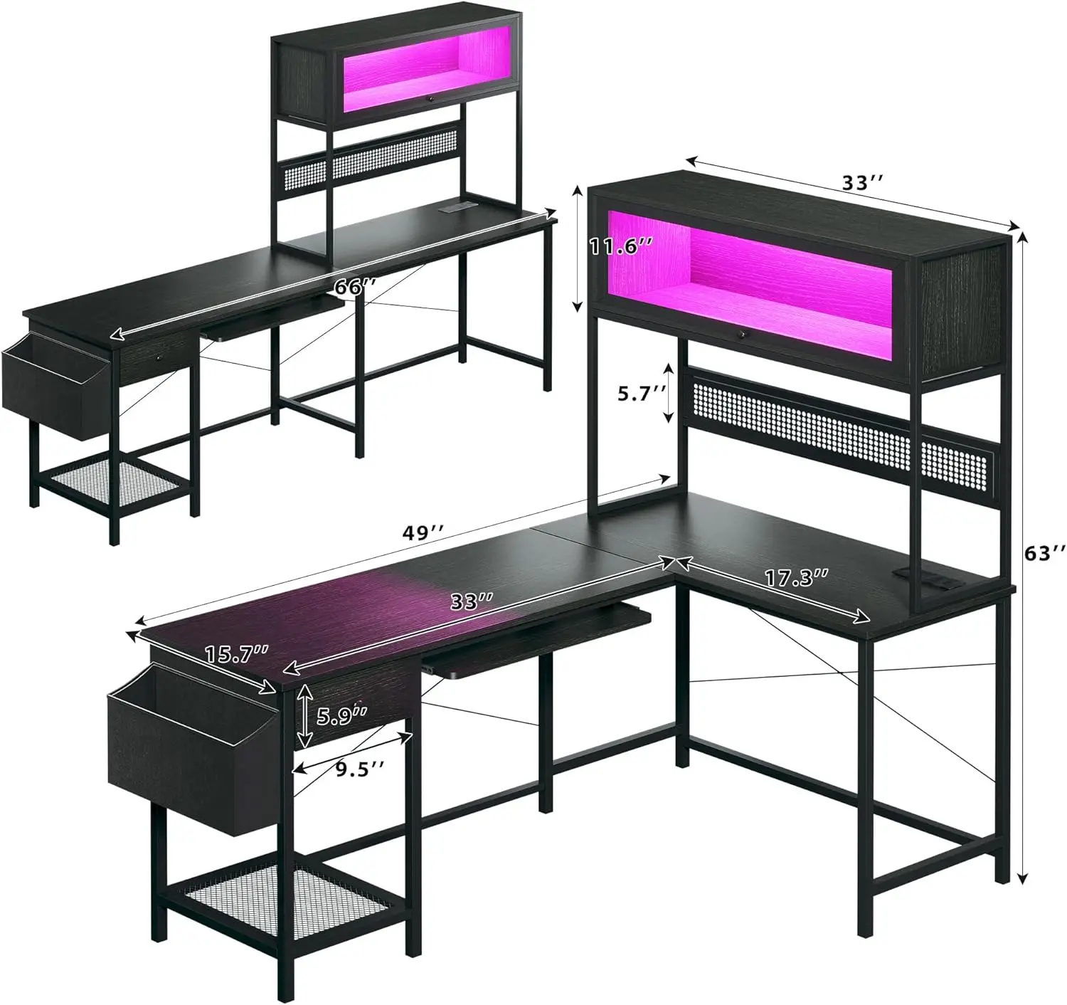 - Magic L Shaped Gaming Desk: Gaming desk comes with display cabinet, pegboard, 2 LED strips, power outlet, keyboard tray, 3-S hooks, storage bag, top hutch and CPU stand. Gaming desk could hold 1 desktop computers and 1 notebook computer. Such a magical and all-in-one gaming desk combines functionality and displays, perfect for small rooms to create an excellent gaming space.