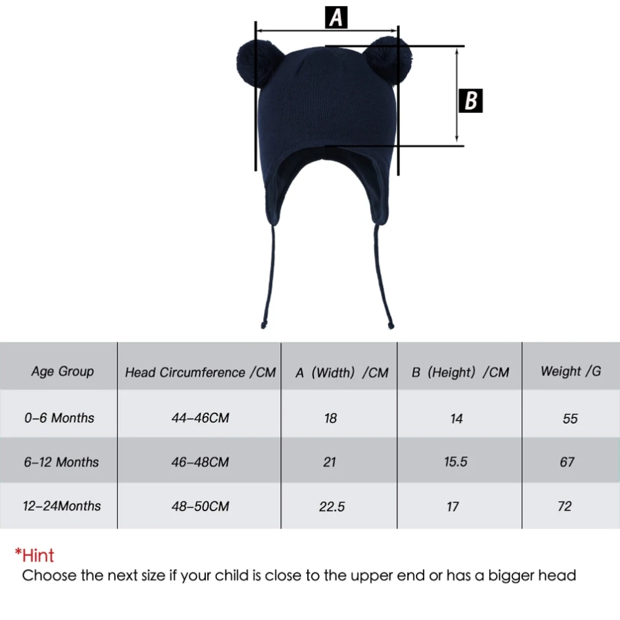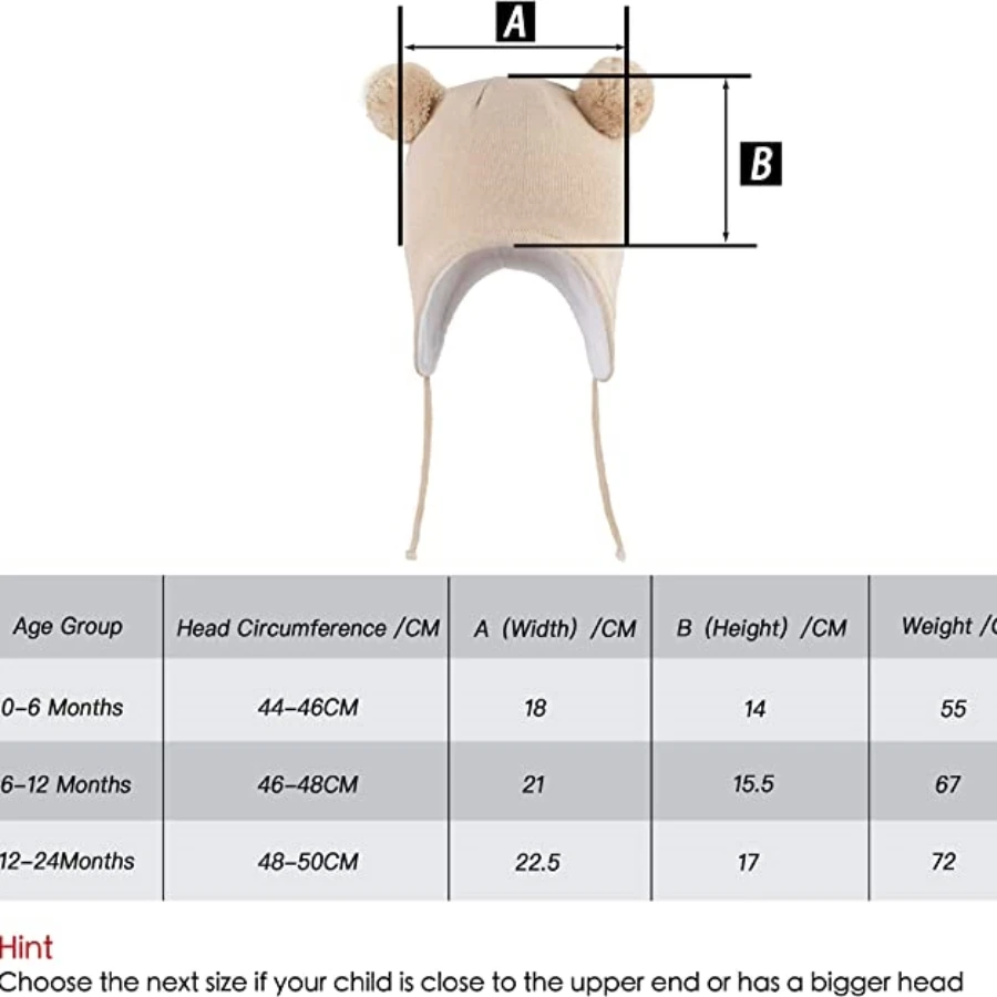 SIZE:The kids winter hat has different sizes available in stock. Size S for 6-12 months old; M for 1-2 Years old; L for 2-4 Years old. Stretchy,flexible and durable.
