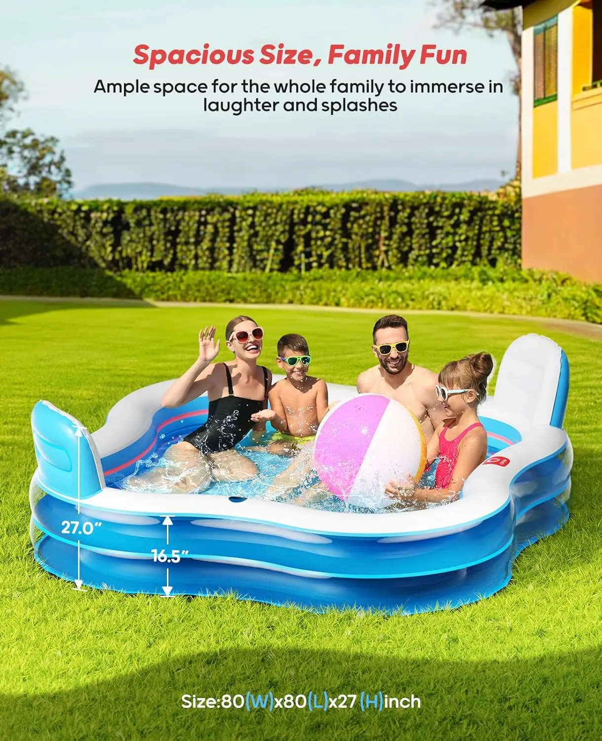 Large 80x80x27 Inch Inflatable Swimming Pool with 2 Seats and Backrests for Family Fun in Backyard, Garden, Outdoors
