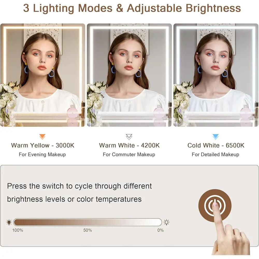 Tile Mirror Lighting s: Equipped with three distinct lighting effects—natural light, warm light, and cold light—cater to makeup lighting needs for various scenarios. It’s the ideal choice for home makeup enthusiasts, professional workplace individuals, hair salons, and studios.