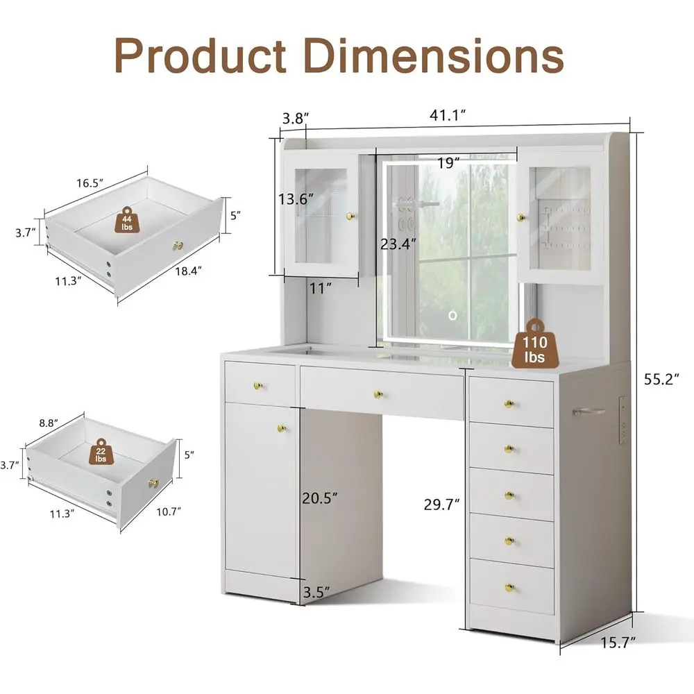 1 review for Large LED-lit Glass Top Makeup Vanity Desk with 7 Drawers, 3 Cabinets, and Charging Station, White