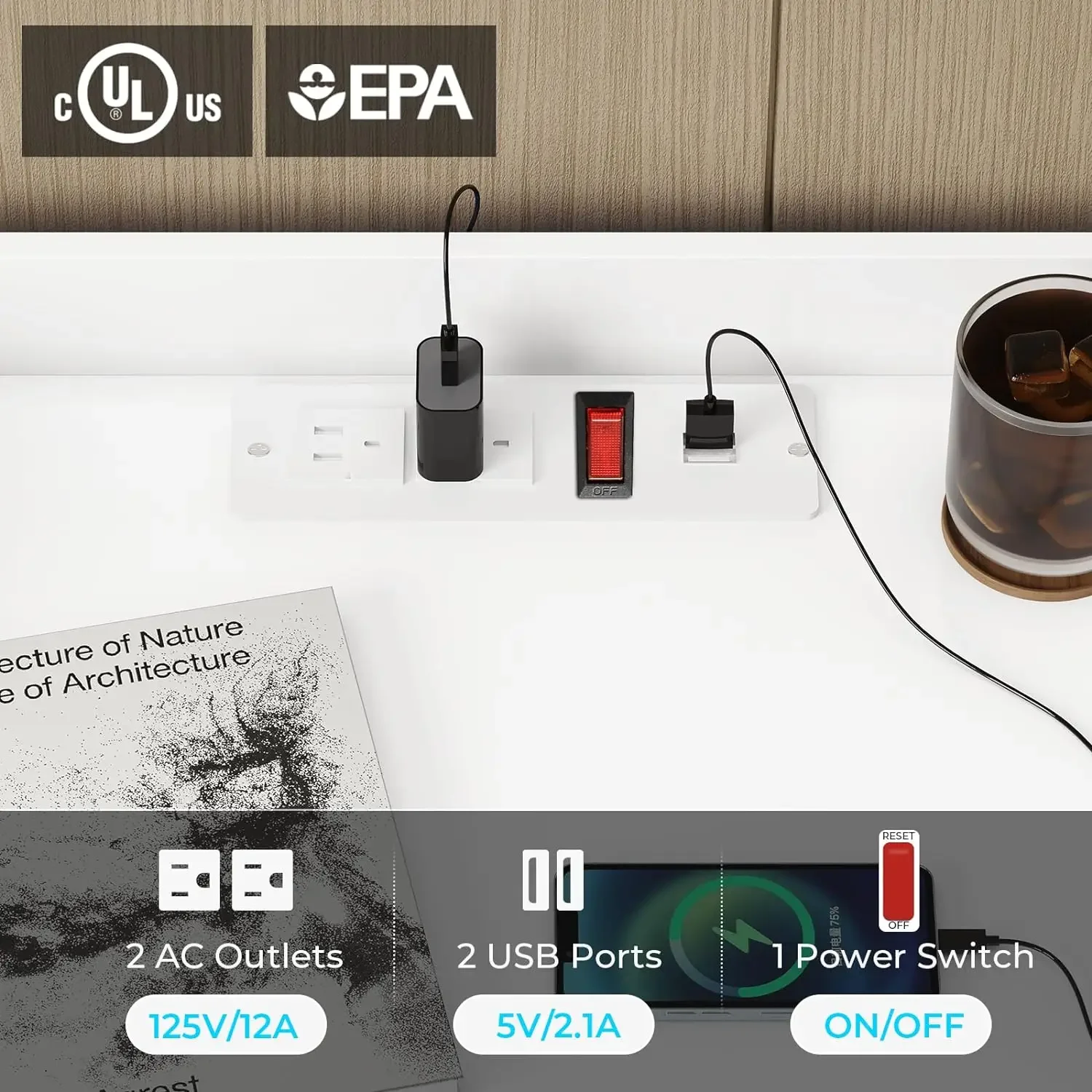 - 【Convenient Power Strip】The top of the nightstand has a built-in power strip that includes 2 USB ports and 2 standard outlets within reach when you’re sitting on your bed or couch, making charging so convenient. In addition, a red switch on the power strip improves safety.