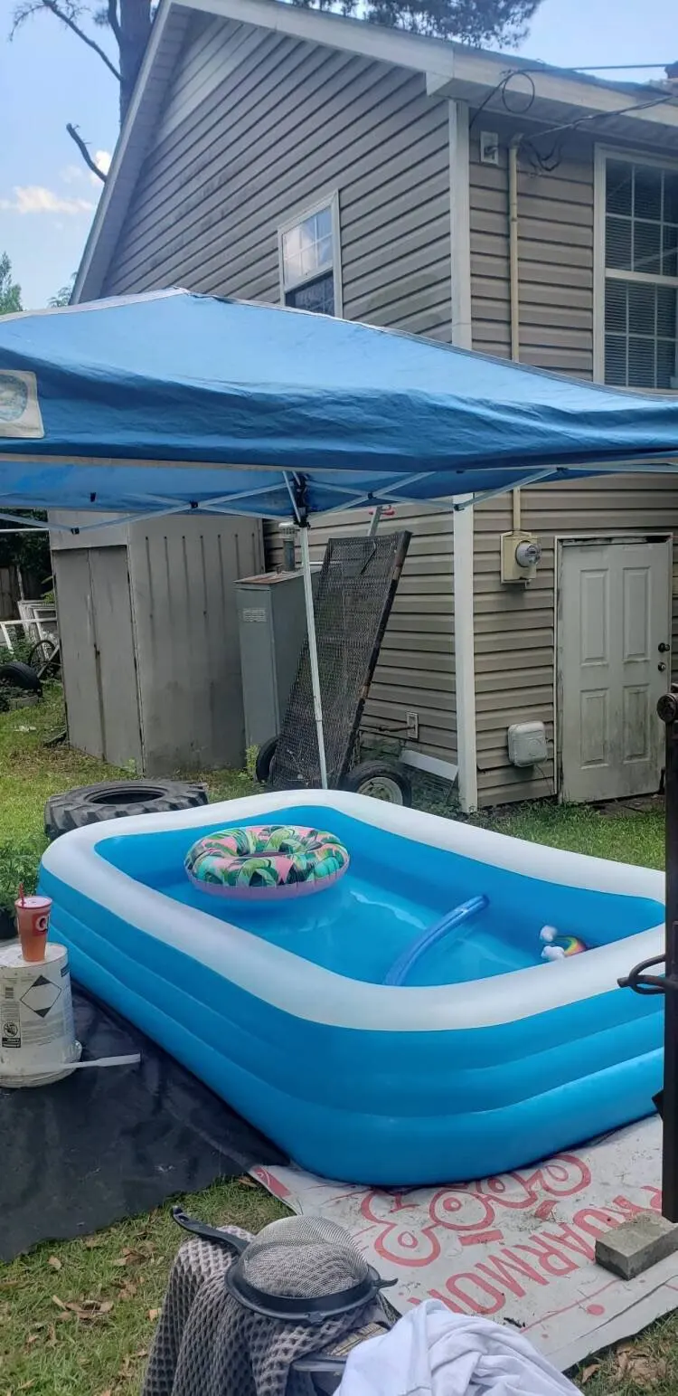 Overall, this is a nice pool. The pool was easily inflated. It’s the perfect size for my toddler to play in and to still have room to sit in the pool with him. The sides hold up well to my toddler constantly climbing in and out. The tray table is a nice bonus for adults trying to relax.