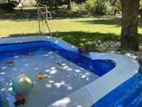 I really like this swimming pool. I bought it to lie down and cool myself down, it’s perfect! It blows quickly with an air pump and is filled with water in less than an hour! I have been using it for three days and my condition is still great. I love it!