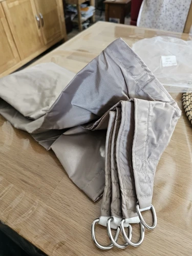 Looks very good. We have already installed it and it covers the area we wanted very well. The color looks great. We are happy. It arrived within the estimated time, without any problems and in perfect condition. I will upload photos when I can. I want to check if it holds up well against wind, water, etc… although we have tied it with springs so that the wind’s pulls are not so strong.