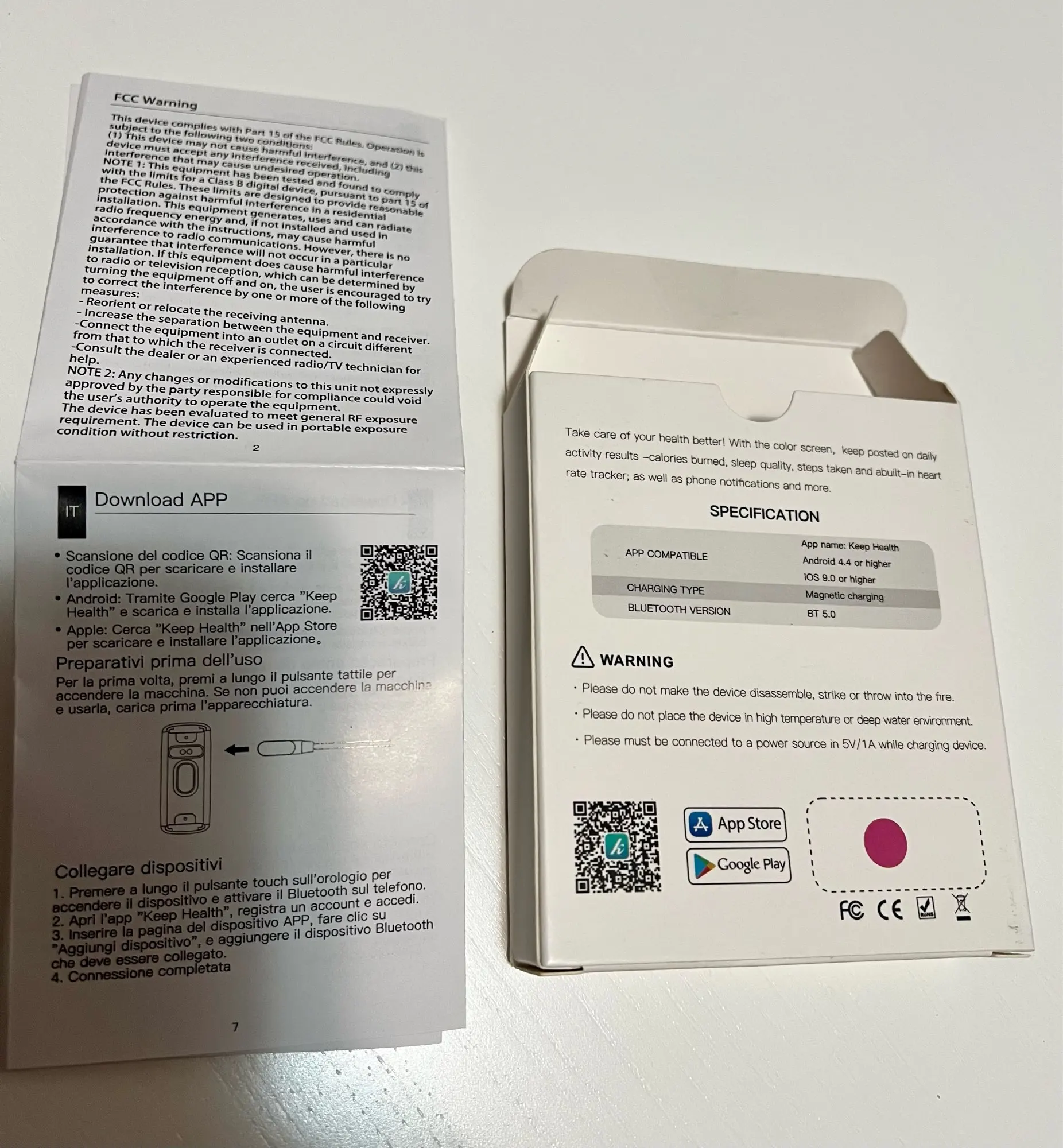 Fast delivery and well packaged. I must say that it’s really nice and so far I’ve tried it and it works well. The box contained not only the smart band, but also the multilingual instruction booklet (with the QR code to download the app) and the cable to charge it. I fully charged it on Monday and used it twice at the gym, and today it’s Wednesday and it’s still almost fully charged. Although very simple because it has only one button to manage the screen, it works very well. The screen is very clear and you can also choose the dial design or set your own photo. Anyway, exactly what I was looking for to record functions during the day and when I go to the gym. Now I will use it for a while, hoping it continues to work so well. I can only recommend it for now, I am very satisfied!!! The app is very simple and intuitive, it syncs quickly with the smart band to record data.