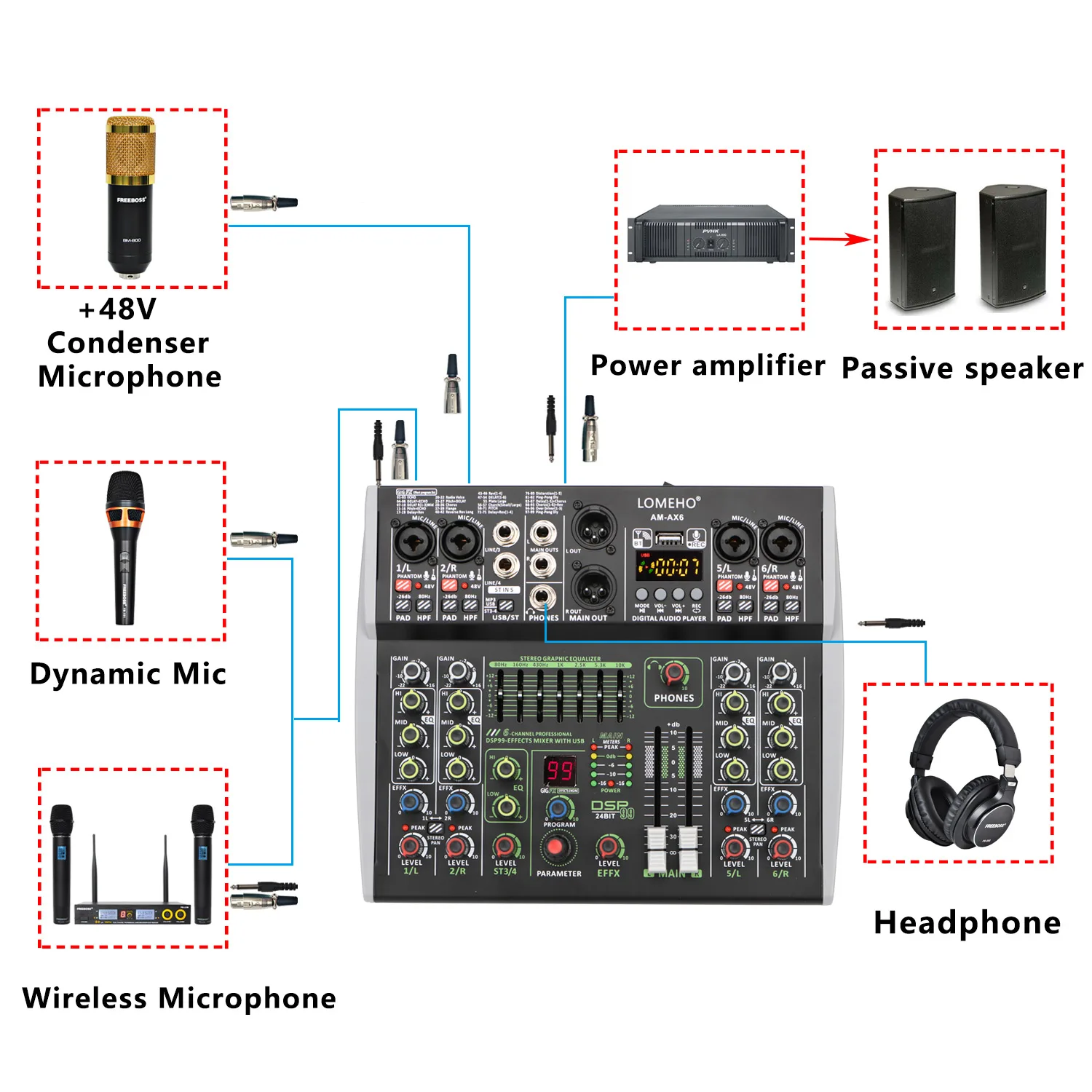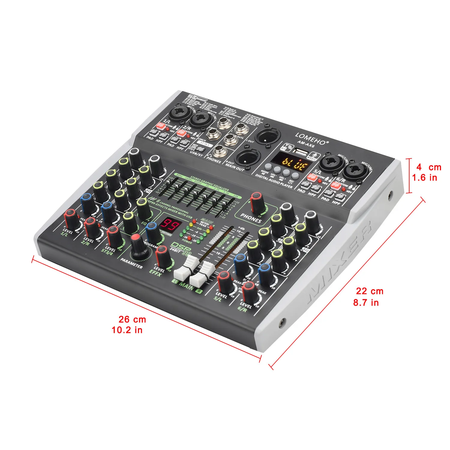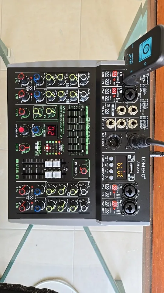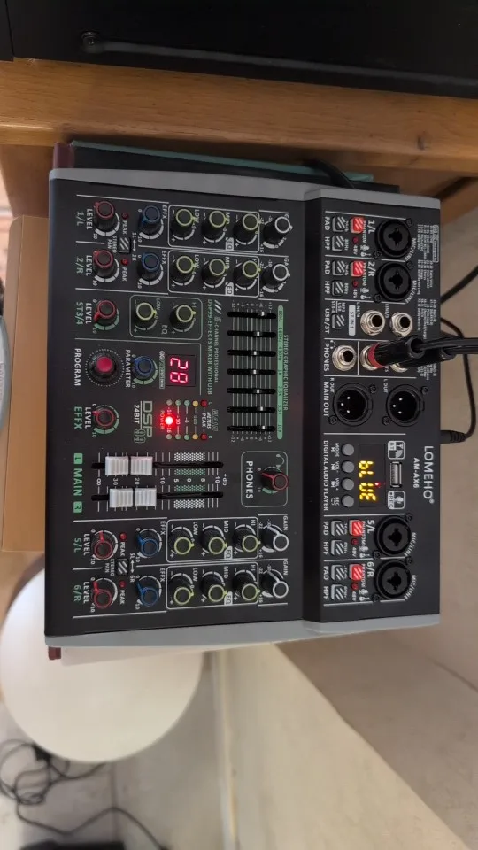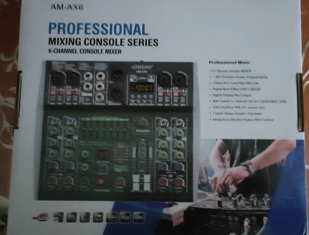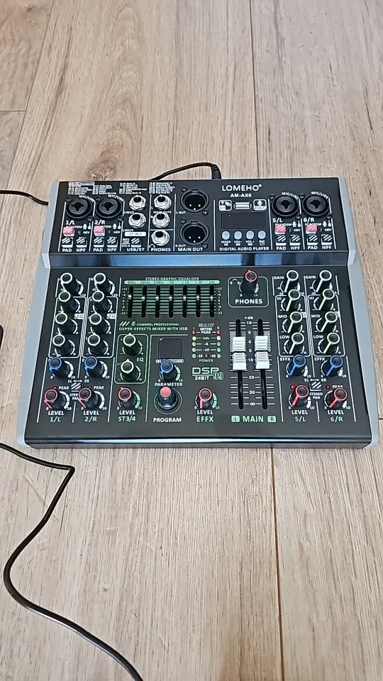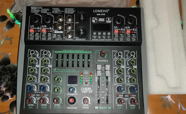 15 reviews for Lomeho 6 Channel Mixing Console Bluetooth 7 Band EQ Audio Sound Mixer 48V 99 DSP Effects Professional USB PC Karaoke AM-AX6
