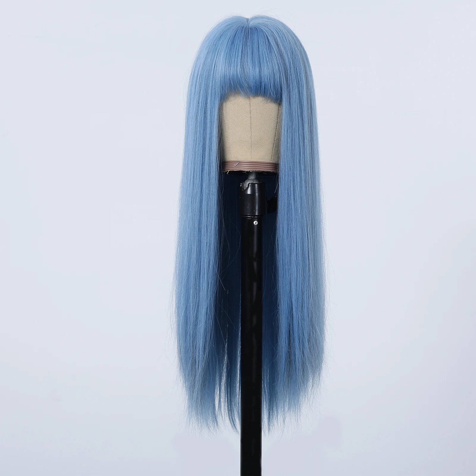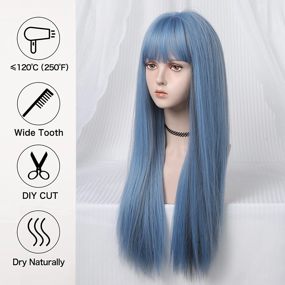 Long Straight Synthetic Wigs Light Blue with Ash Highlight Cosplay Wig with Bangs for Women Natural Hair Heat Resistant Fiber