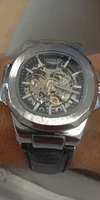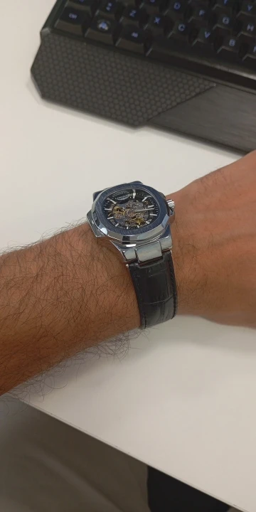 I wanted a skeleton watch, and this one looks just like the photo, but not the video. In the photo the crown (stem) is silver (stainless? ), but in the video its a blue gem like on a santos. It’s ok with me bc i only looked at the photo b4 buying and didn’t notice the difference in the video until after. Note: its an automated watch, so if you dont wear it you may want to get a winder.