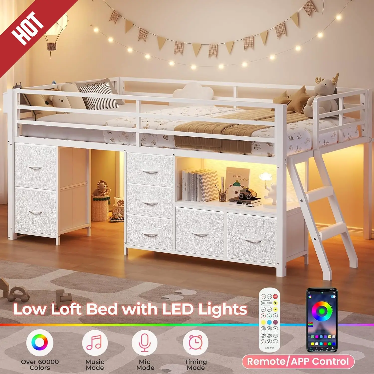 Low Loft Bed Twin Size with 7 Storage Drawers, Bookcase and LED Lights, Metal Kids Loft Bed with 14″ H Safety Guardrail