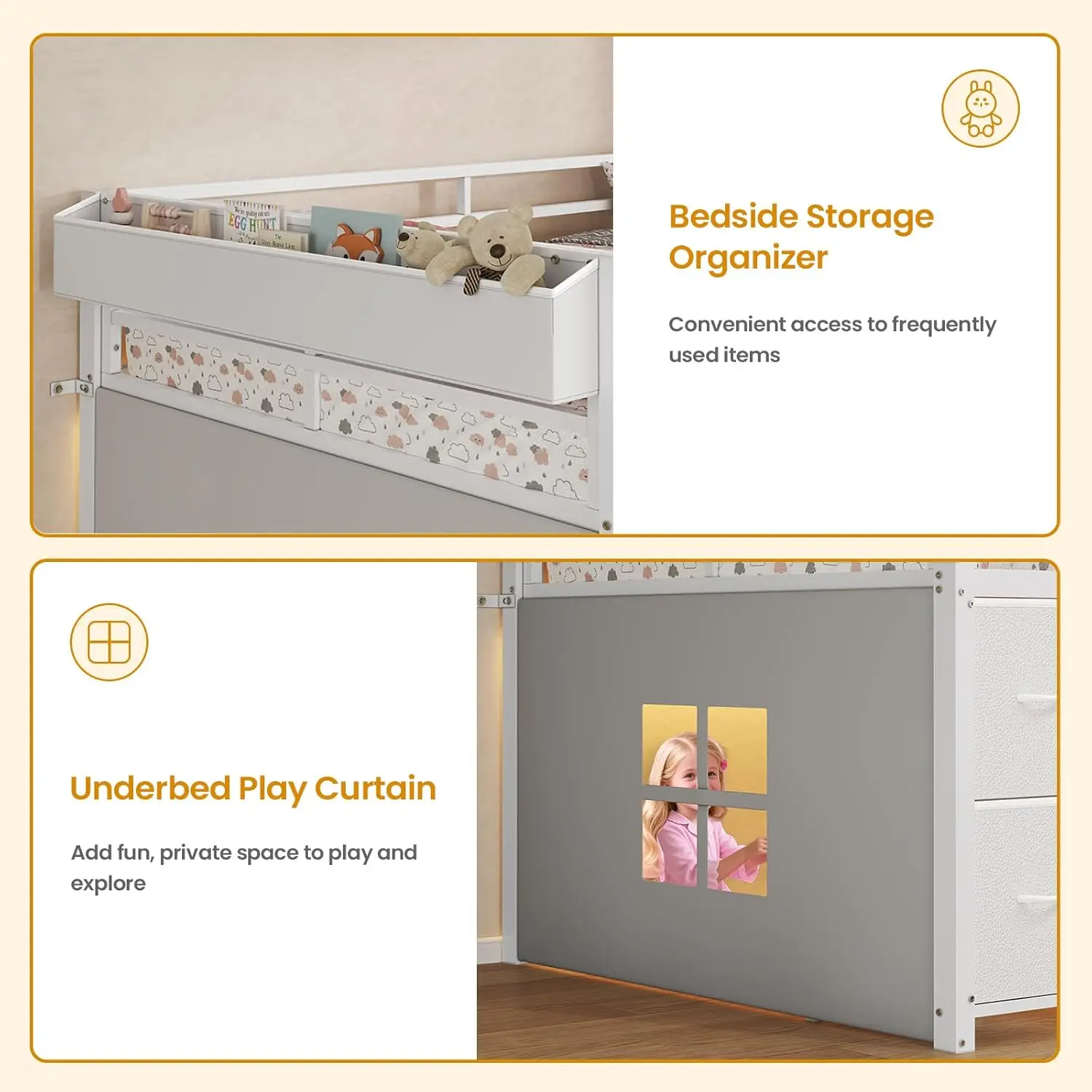 - 【Multifunction Loft Bed】Not just a bed—it’s your child’s ultimate sleep-storage-play headquarters! This low loft bed combines cozy sleeping space, massive storage(7 deep fabric drawers, open bookshelve), and a secret play fort—all in one space-saving design. Also comes with play curtain,LED lights, Every inch is engineered for fun, function, and unforgettable adventures!