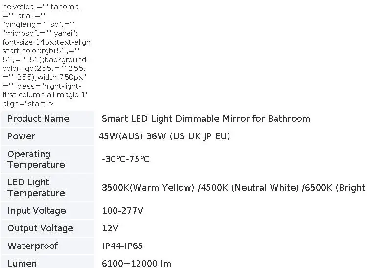 | Item | LED Light Dimmable Defog Bath Mirror |