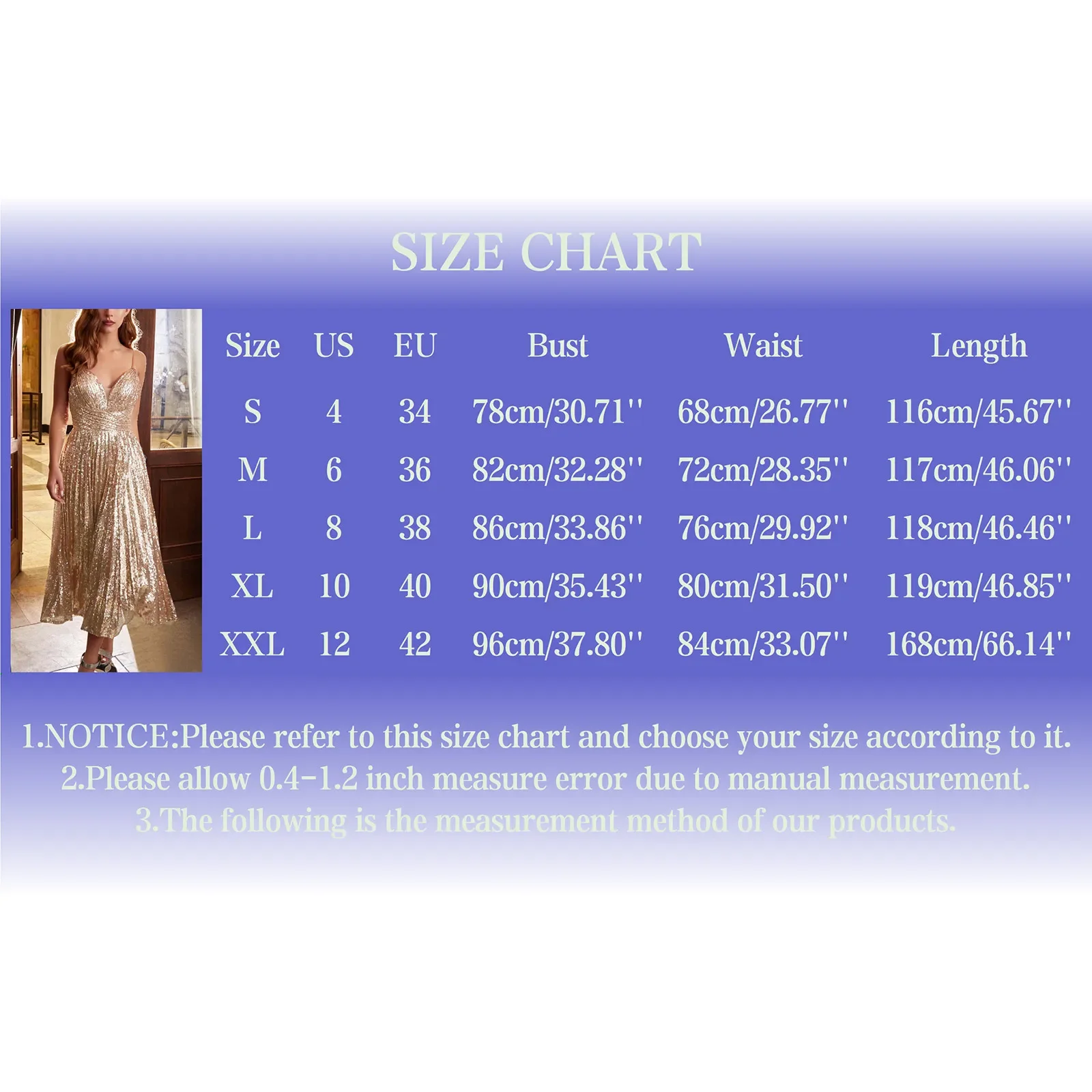 I ordered XL based on my waist and hips. It fitted just right, but the zipper was tricky to close due to its poor quality. The chest is way to large for my breasts. I wear 12B and there was a lot extra fabric on my chest, I’ll need to fix it. The strap was sewed twisted. I also need to fix that. As for the length, I’m 1.63 and it’s just over my ankles. Be prepare to “shed” a lot of sequins.