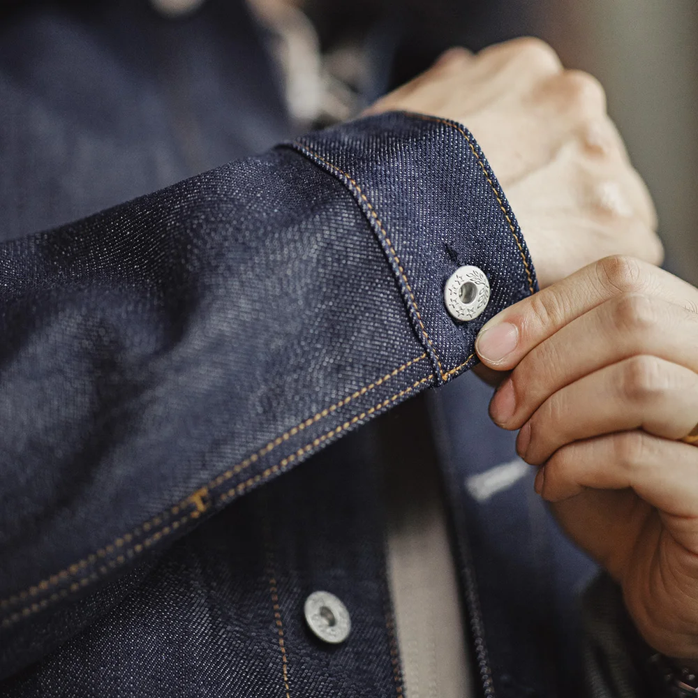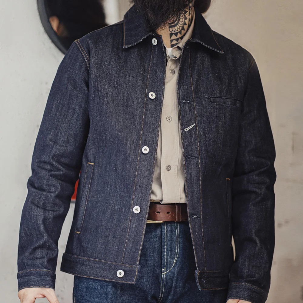 Maden Retro Men's 16.5oz Denim Jackets Heavyweight Cotton Lapel Jacket Solid Color Printed Classic Coat for Autumn Outerwear