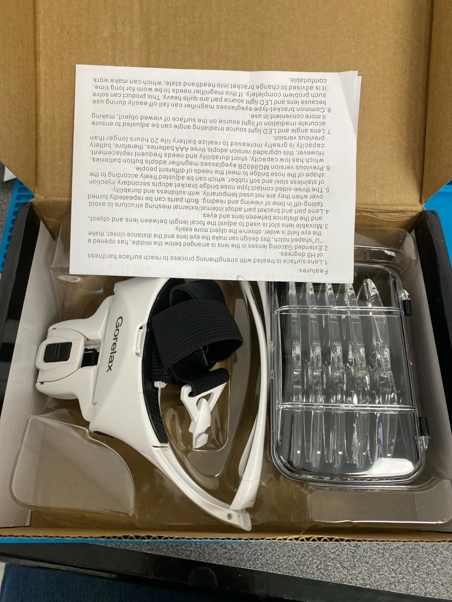 Excellent and beyond expectation. Worked as described and fine with my glasses as long as i put this on first. The light works fine with aaa. The case for the lenses is a nice touch.