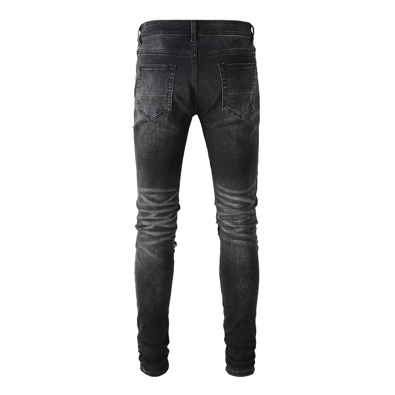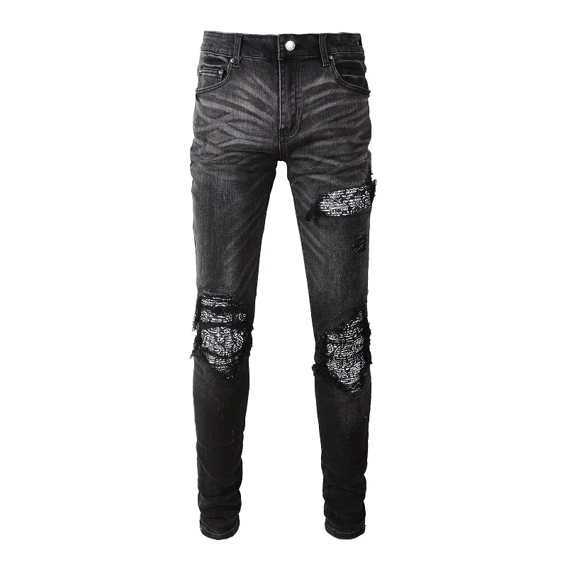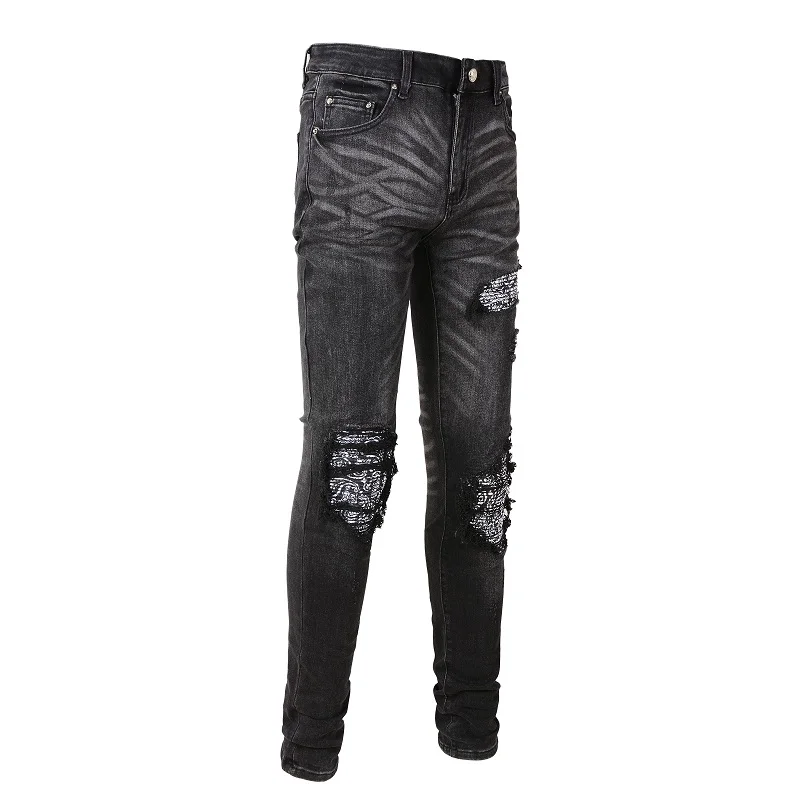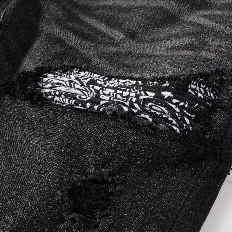 Men Bandanna Paisley Print Patch Jeans Streetweat Patchwork Holes Ripped Biker Pants Skinny Tapered Black Stretch Denim Trousers