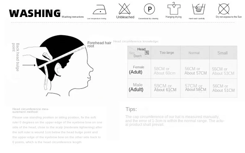Hat circumference: 22-22.8 in/56-58 cm, Hat brim: 5cm, Hat height: 11cm.