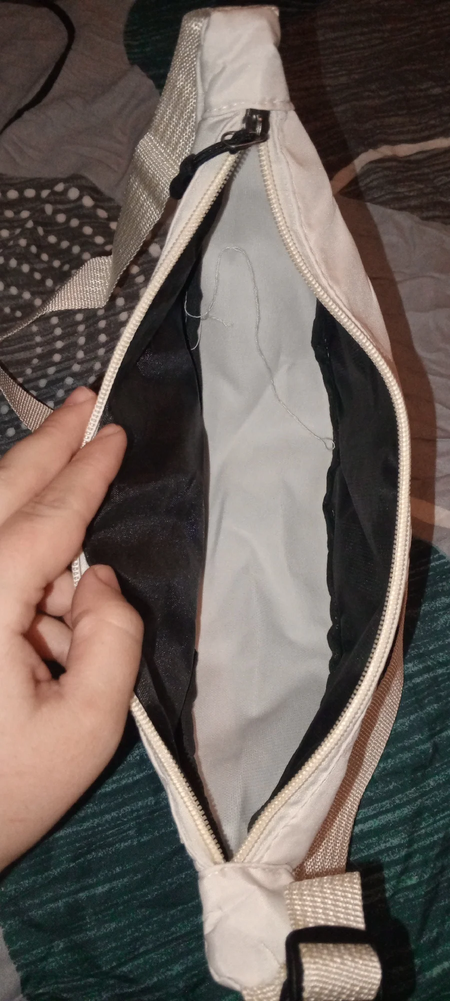 The quality is super! The fabric on top is like a waterproof sports jacket. Inside there’s an extra layer of fabric, like an umbrella’s fabric. Overall, it’s great! I didn’t expect such a cool bag to arrive. There are threads, but cutting them off takes 2 seconds. Spacious. I recommend it.