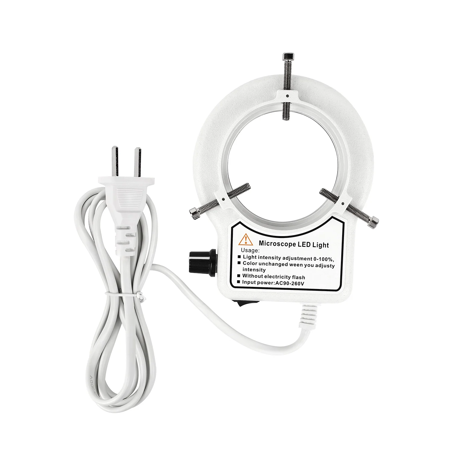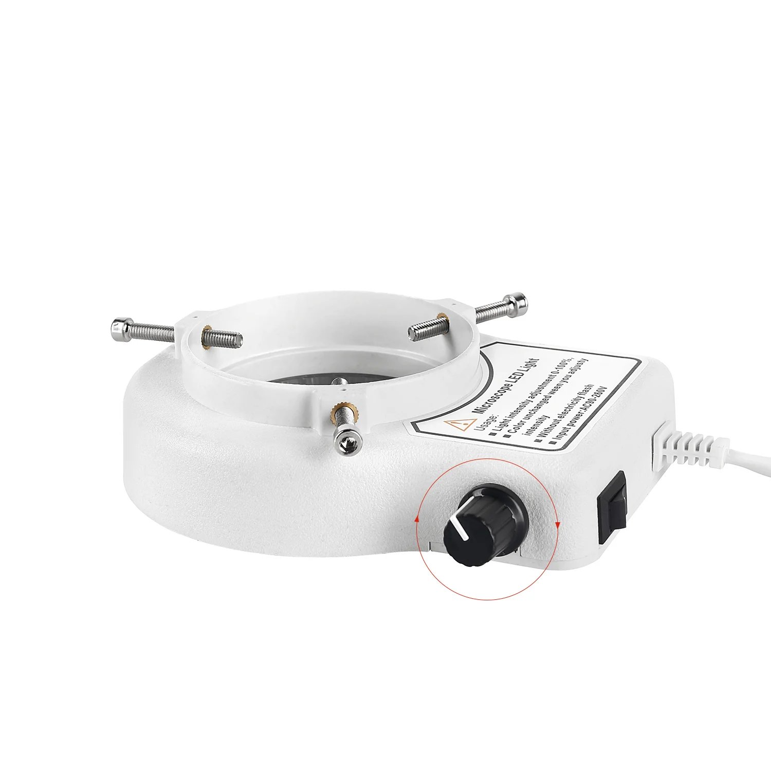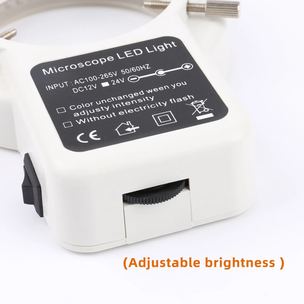 Small auxiliary light, suitable for a variety of light filling scenes. Brightness can be adjusted. Can be installed on the lens, can be installed on the objective lens of the three-eye microscope, two kinds of length mounting screws for adjusting installation.