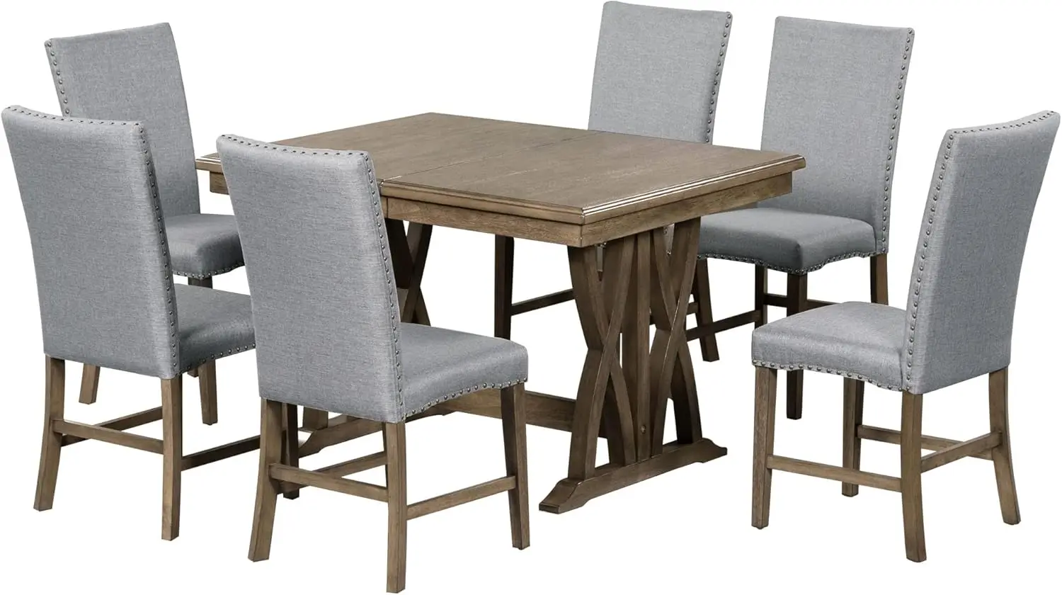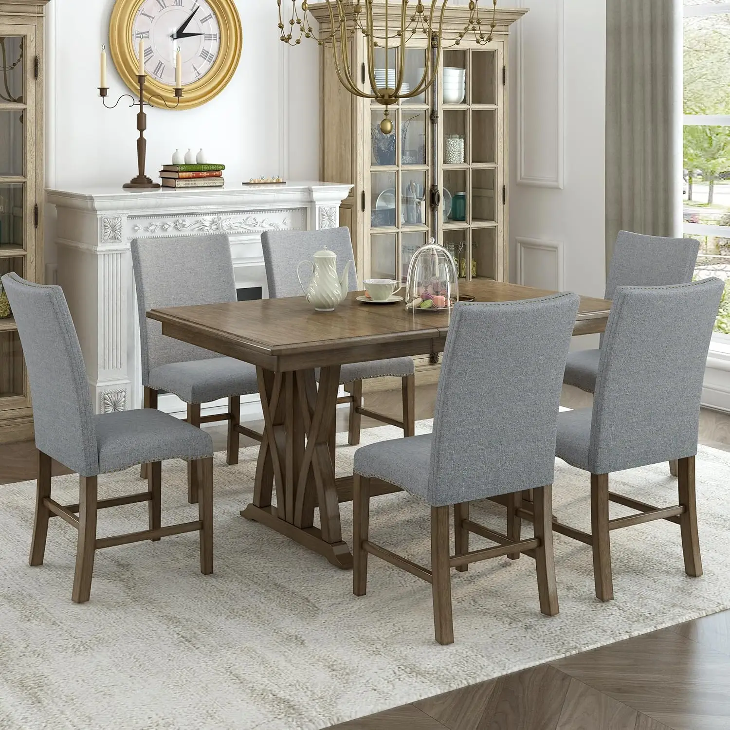 - [7-Piece Dining Room Set]: The modern dining set consists of an extendable rectangular table and upholstered dining chairs. The classic retro trestle base and cross table legs have an elegant temperament, perfect for a group gathering.