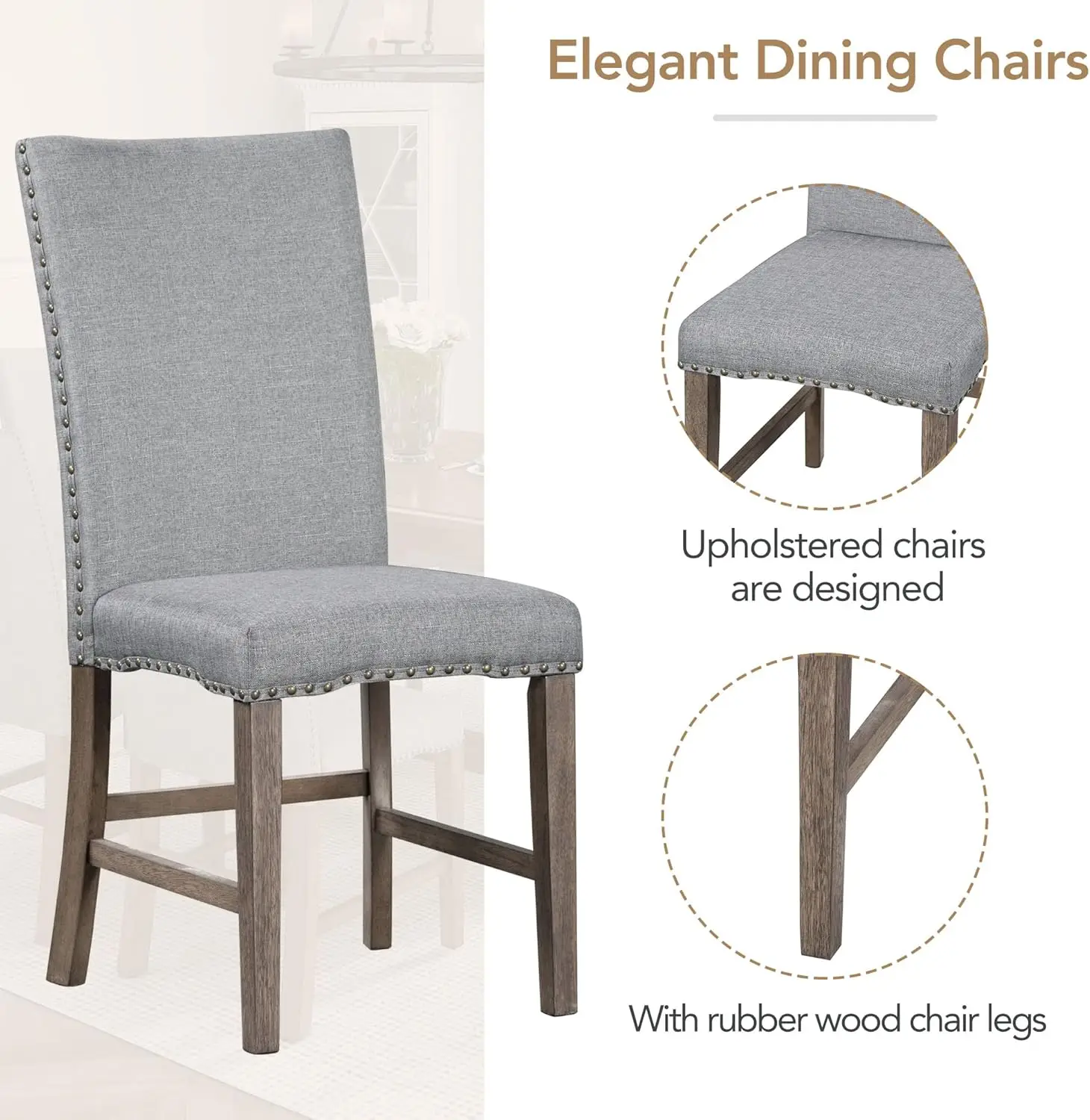 - [Comfortable Upholstered Chairs]: The ergonomic dining chair is upholstered in soft linen and filled with high-resilience sponge to provide better support for your body and a better dining experience, which is finished with nailhead trim for added appeal.