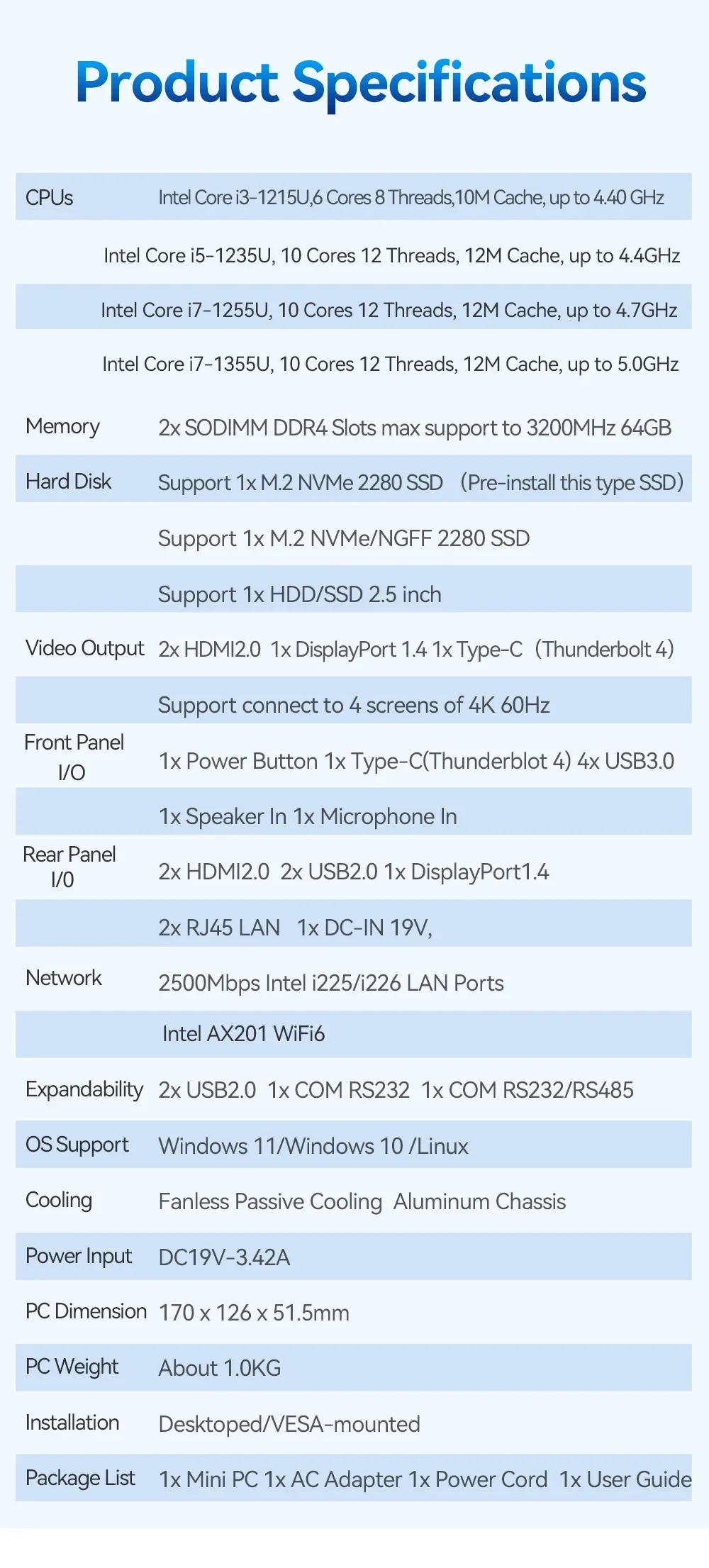 Be the first to review “MINI PC 13th Gen Intel i7 1355U i5 1235U Min PC 10 Cores DDR4 M.2 NVME SSD Windows 11 4K UHD WiFi6 Powerful Offices Barebone” Cancel reply