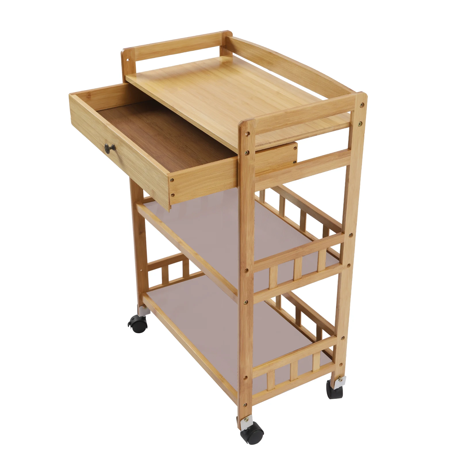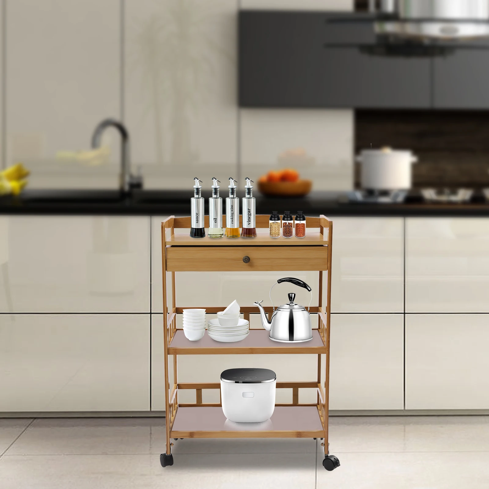 Sturdy and Durable: The mobile cart is made of high-quality bamboo while using a superb high-temperature carbonized treatment, which is very strong, durable, and corrosion-resistant.