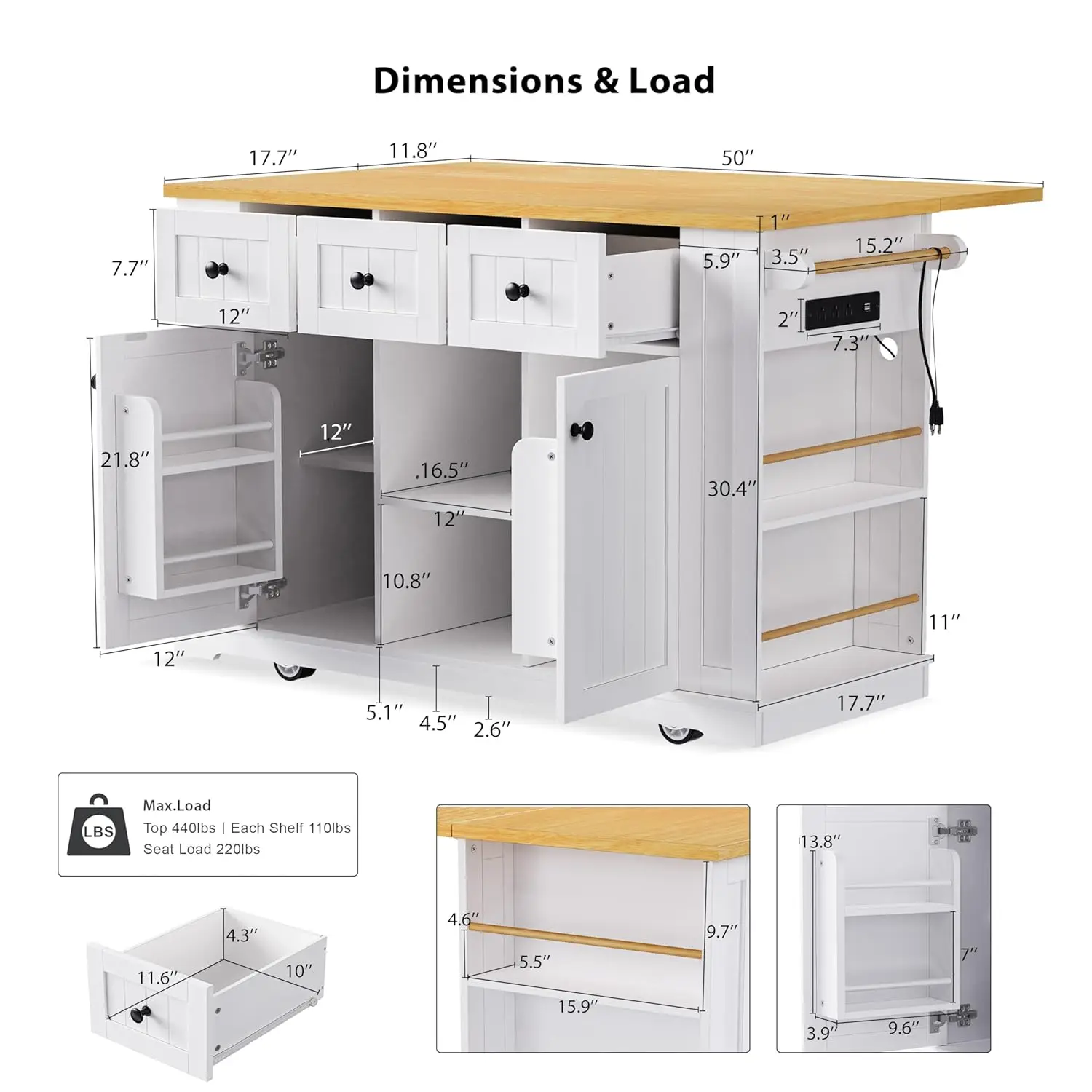 【Power Up Your Kitchen Effortlessly】With 3 AC outlets and 2 USB ports, blend, brew, or charge without leaving the island. Ideal for busy mornings or meal prep