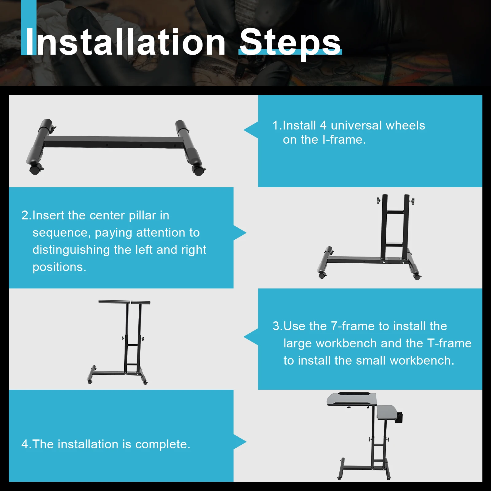 This tattoo workbench stand is made of high-quality iron and high-density board, which is sturdy and stable. The adjustable desktop height bracket and easy-to-move universal wheels make you more convenient to use. In addition, the baking process and rounded corners make the overall shape novel and beautiful. After a simple installation, this tattoo workbench allows you to start a comfortable tattoo experience.