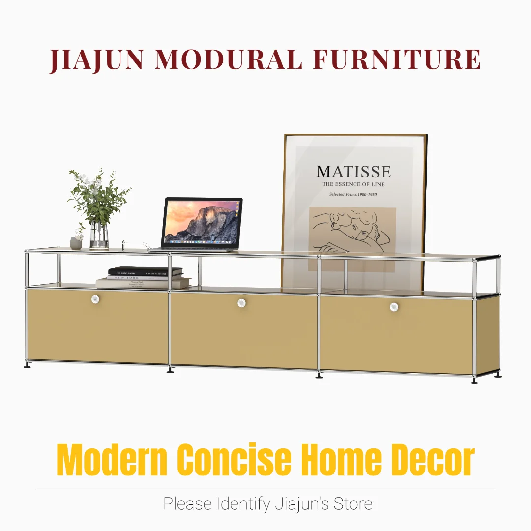 Modern Modular Low TV Cabinet|3-Tier Sideboard with Drop Doors|Steel Frame Storage Bench Unit | Minimalist Low Media Console