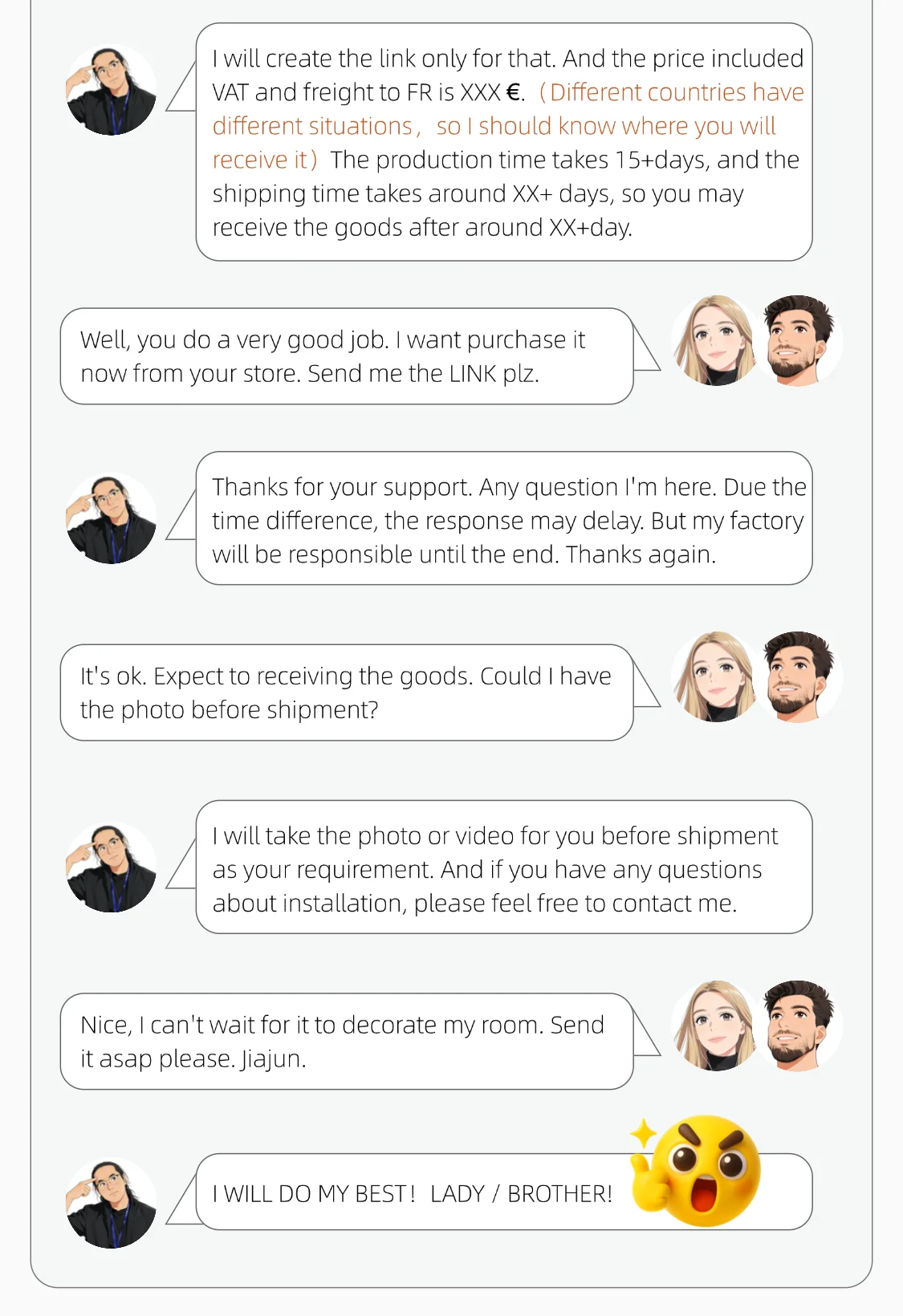 Beautiful product. Jianjun was incredibly communicative and responsive. Would highly recommend purchasing through them. The product itself it’s great and i’m so happy with it!